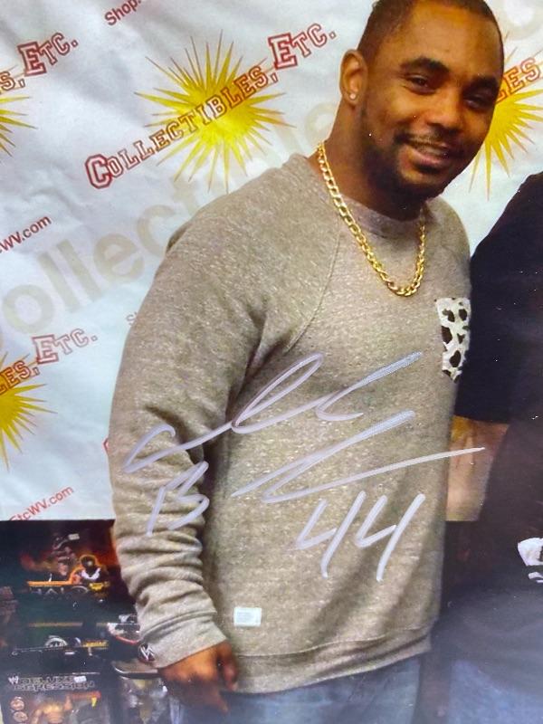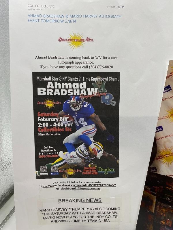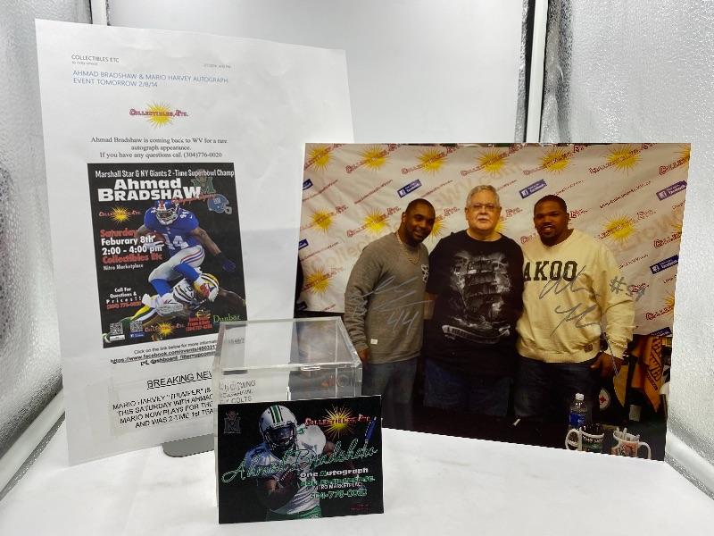Autographed Ahmad Bradshaw & Mario Harvey Football 8x10 Photo. Autograph obtained at a Collectibles ETC. event in Nitro, WV on Saturday February 8, 2014.
