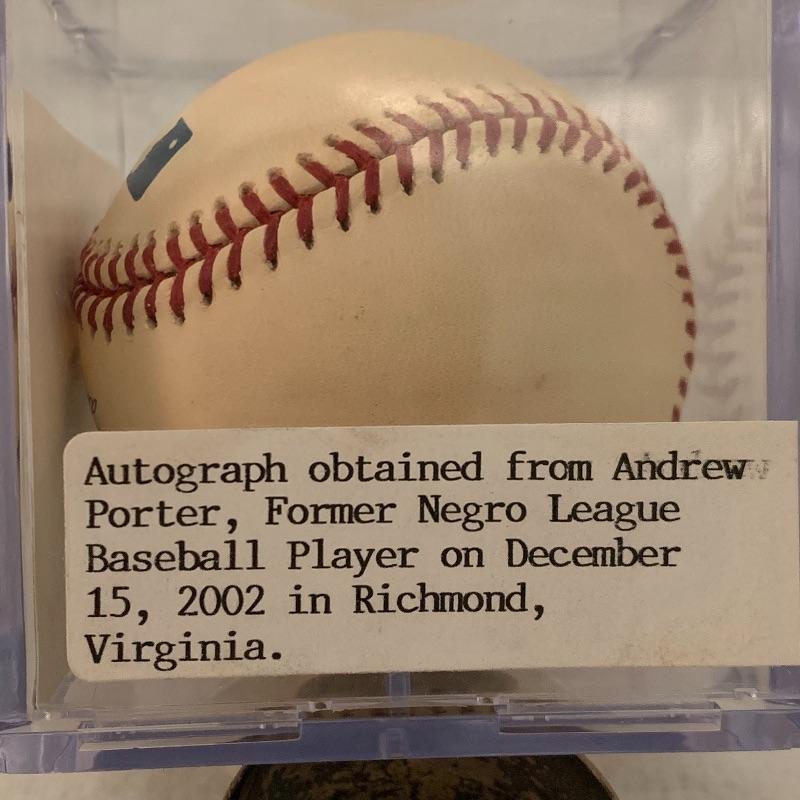 Authentic Autographed Andrew Porter Baseball. Porter was a player in the Negro League. Autograph obtained at an autograph event in Richmond VA on 12/15/2002. Signature is faint.