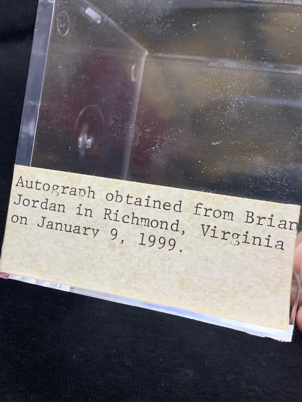 Authentic Autographed Brian Jordan Baseball. Autograph obtained at an autograph event near Richmond, VA on 1/9/1999 .