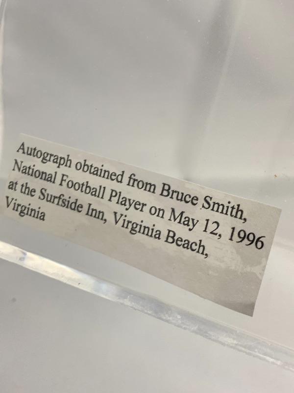 Autographed Bruce Smith Football. Autograph obtained at an autograph event on 5/12/1996 at the Surfside Inn in Virginia Beach.