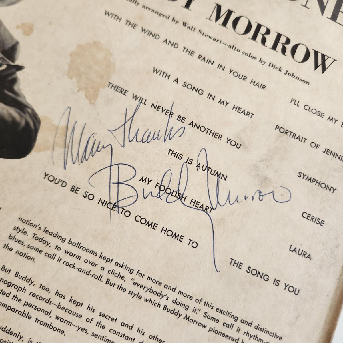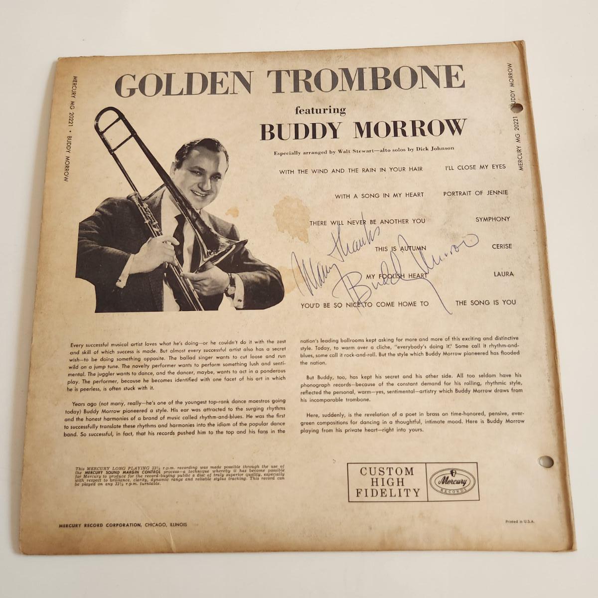 This auction lot is for an Autographed Buddy Morrow Vinyl Record. The record appears to be in good condition but has not been played by us. The cardboard sleeve has seen some wear and has some edge splitting and aging to it. Given to our client who was a trombone player in a Jazz band.