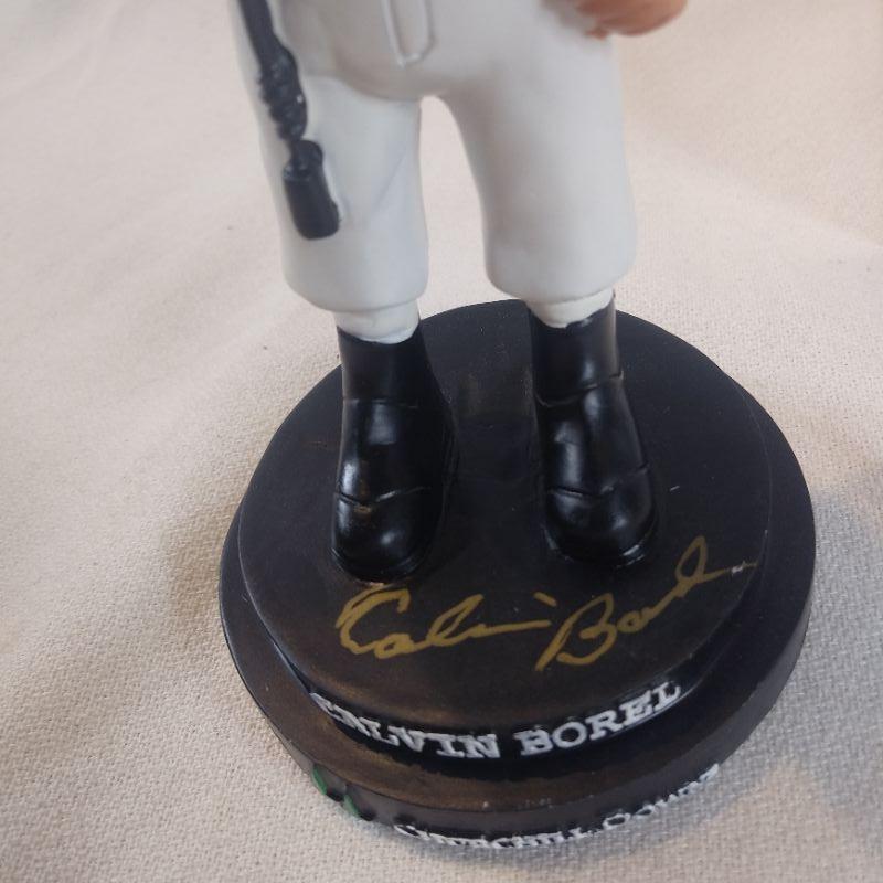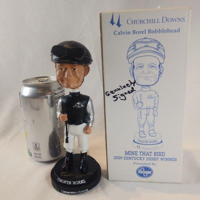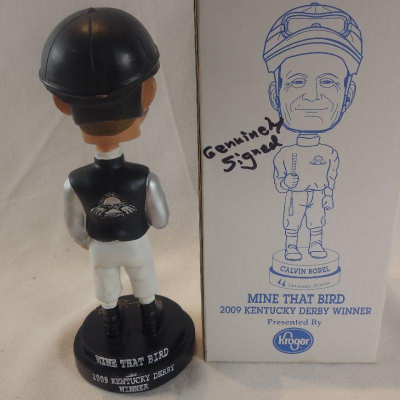 Genuine Autographed Calvin Borel Bobblehead - he is the jockey who rode "Mine That Bird", the 2009 Kentucky Derby Winner. Signed in the presence of our consignor on base of statue by Calvin. He is 7-inches tall - the statue, not Calvin. Found still newly wrapped in box. Reserve Price $15.