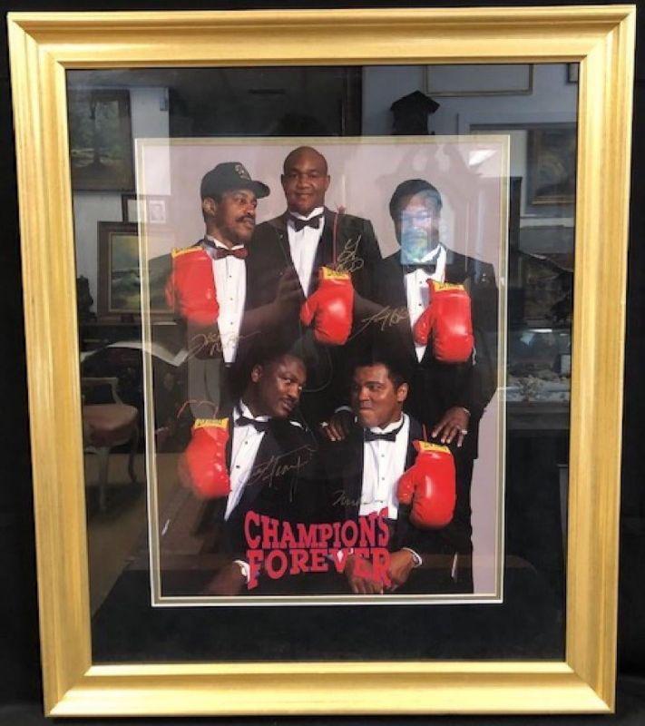 Description: Nicely framed and matted poster depicting a collection of boxing greatest champions, including Ali, Frazier, Norton and Holmes. In 1989, a documentary was produced by Ion Pictures entitled, “Champions Forever.†There were two posters issued; this poster captures the essence of these champion boxer’s personalities in their post pugilistic days. Certificate of authenticity verifies signatures. Material: paper; glass. Measurement: approximate 29"h x 25"w in frame/image 19"h x 15"w (INCHES). Shipping cost: $120; different rates applies for Alaska, California & Hawaii. International rate applies.