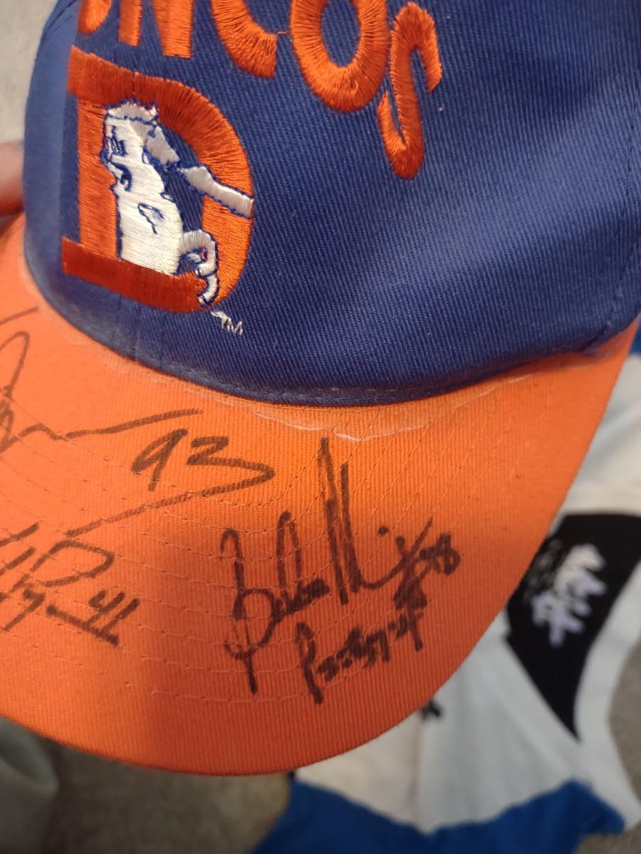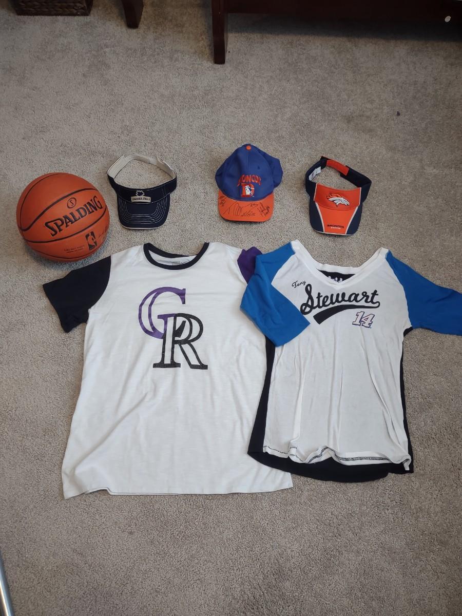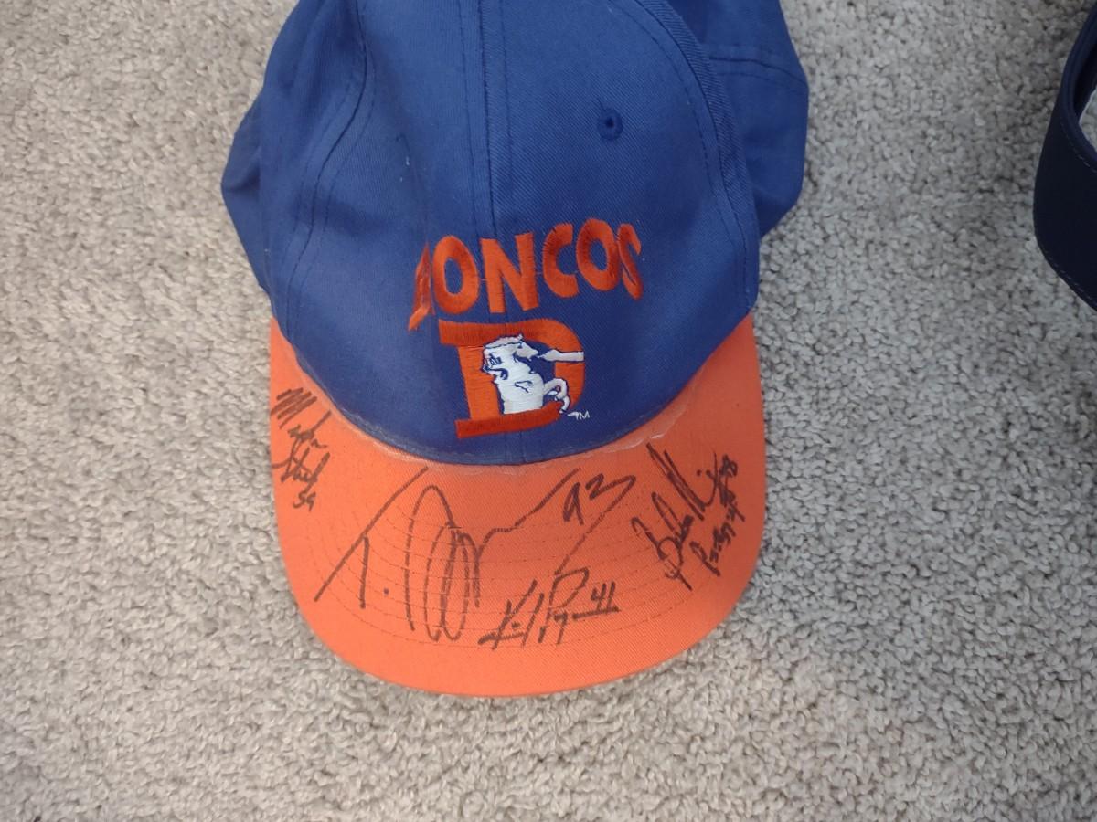 AUTOGRAPHED DENVER BRONCOS HAT, VISORS, BASKETBALL AND SPORT T-SHIRTS