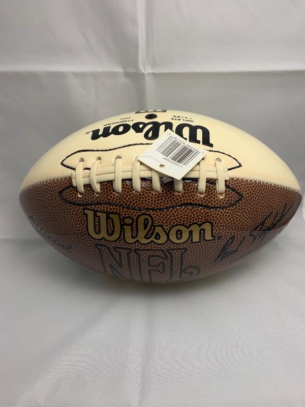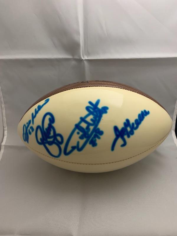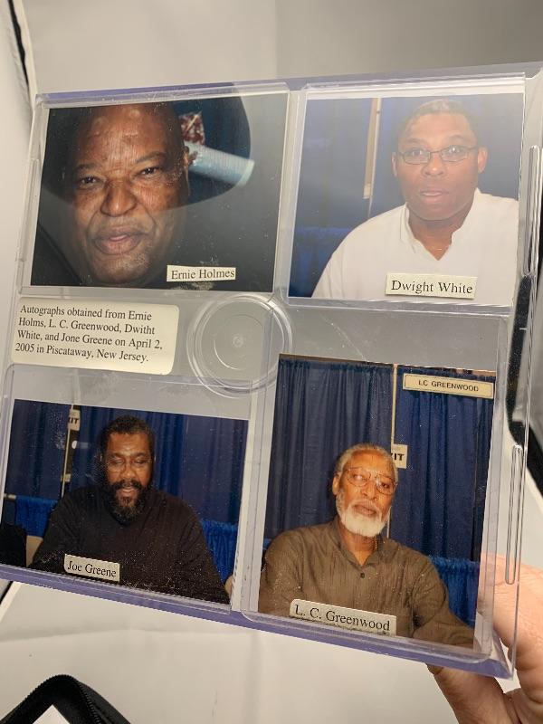 Autographed Ernie Holmes, Dwight White, LC Greenwood, & Joe Greene Football. Autograph obtained at a CSA autograph event.