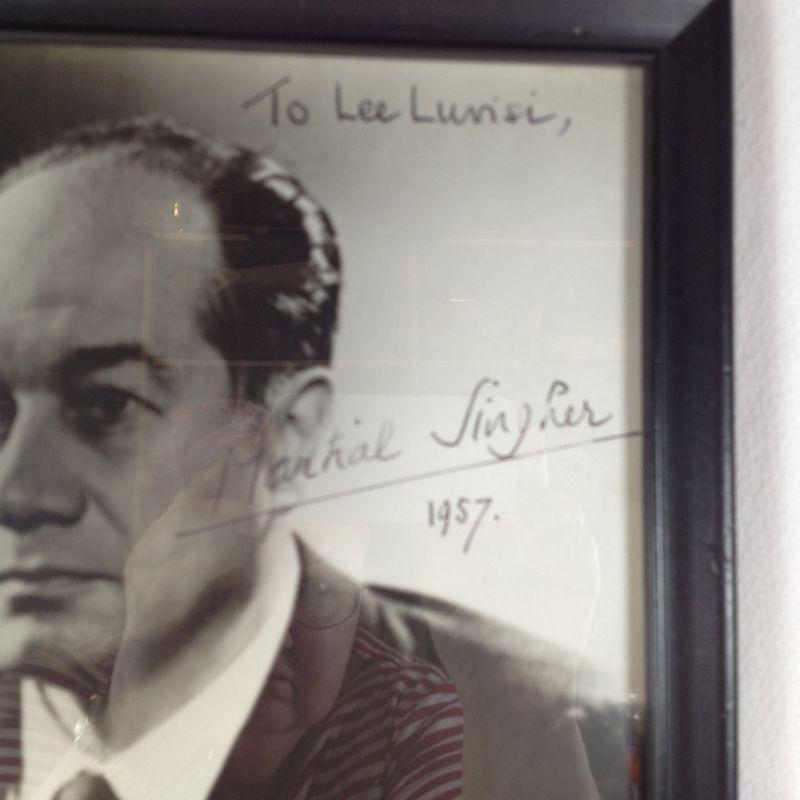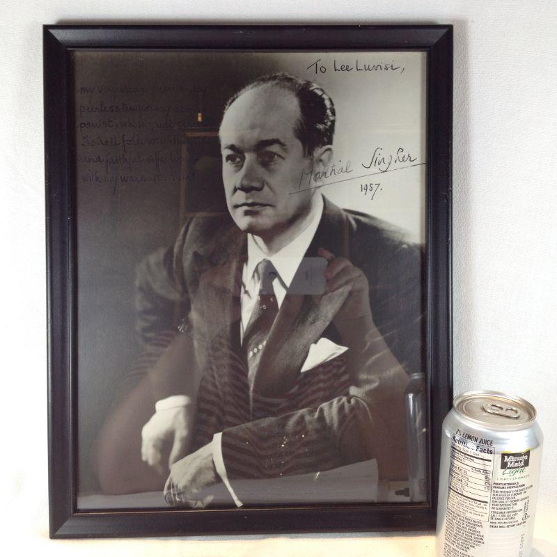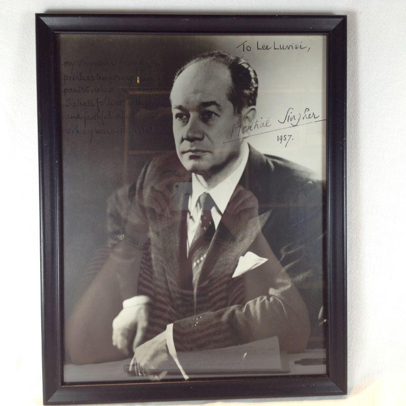 Autographed Framed Photo of Martial Singher. Autographed picture to Lee Luvisi by Martial Singher, dated 1957. Singher was a French Baritone Opera Singer who lived from 8/12/04 to 3/9/90. The framed picture measures 15-inches tall X 12-inches wide. Note: Lee Luvisi, who lives in Louisville is an internationally acclaimed concert pianist and occasionally accompanied Mr. Singher, Note: Will ship WITHOUT Glass.