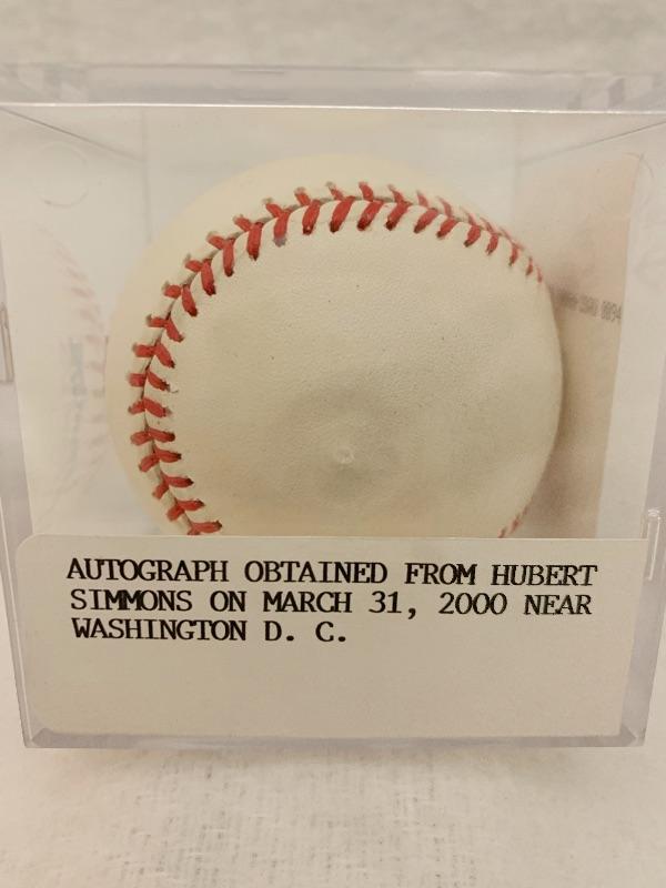Authentic Autographed Hubert Simmons Baseball. Autograph obtained at an autograph event near Washington DC on 3/31/2000.