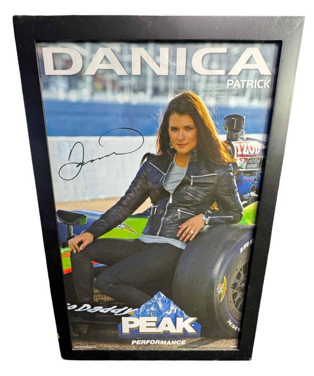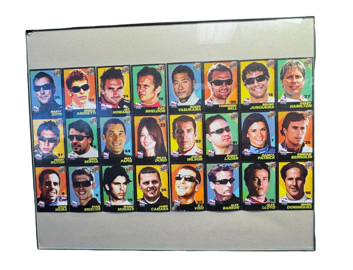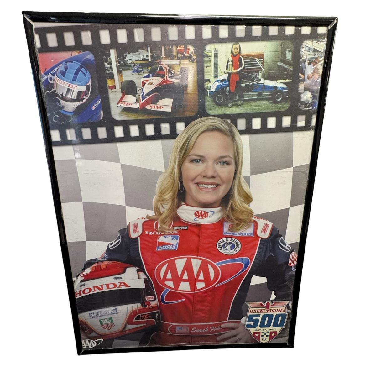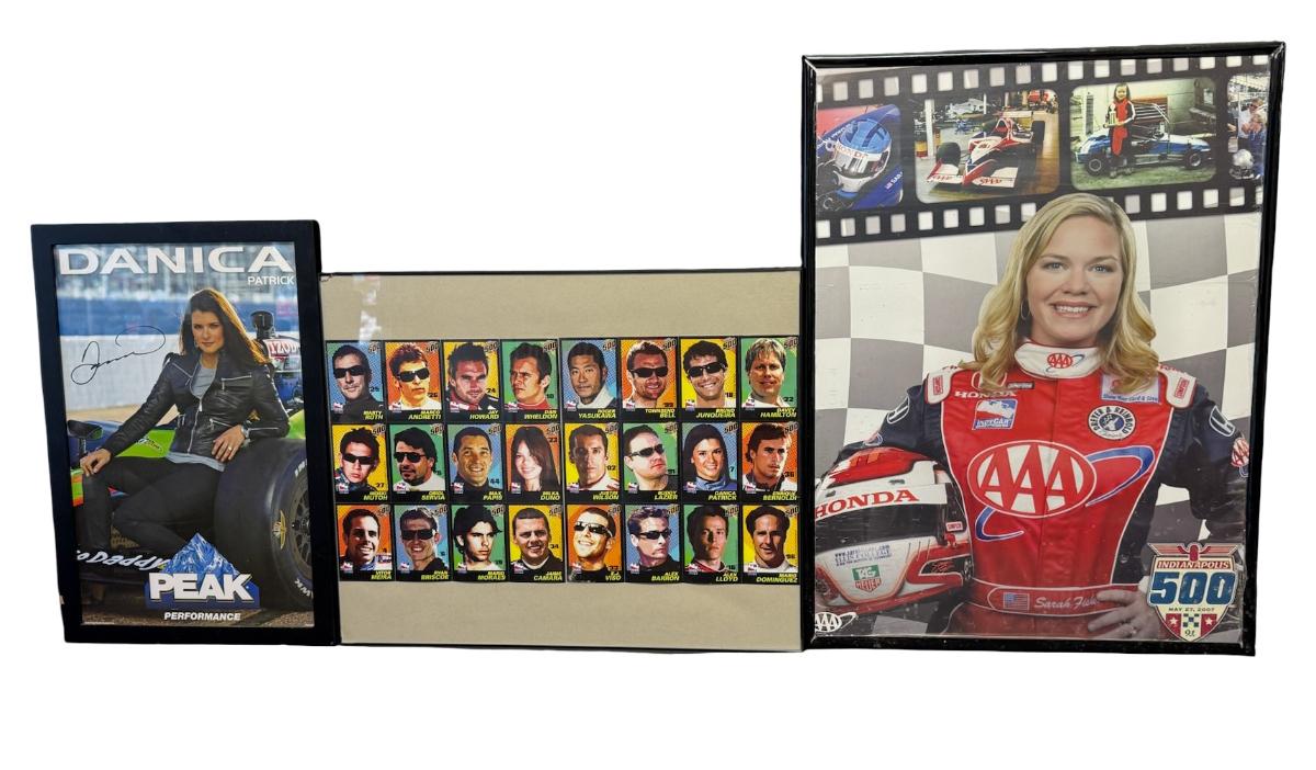 Includes a sheet of uncut Indy 500 trading cards, a framed Sarah Fisher poster, and an autographed Danica Patrick poster. Total of three pieces. All are framed. The autographed poster is not authenticated. Pre-auction estimate: $50-$100.