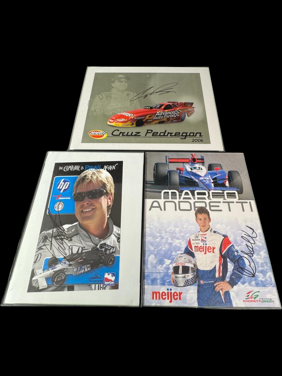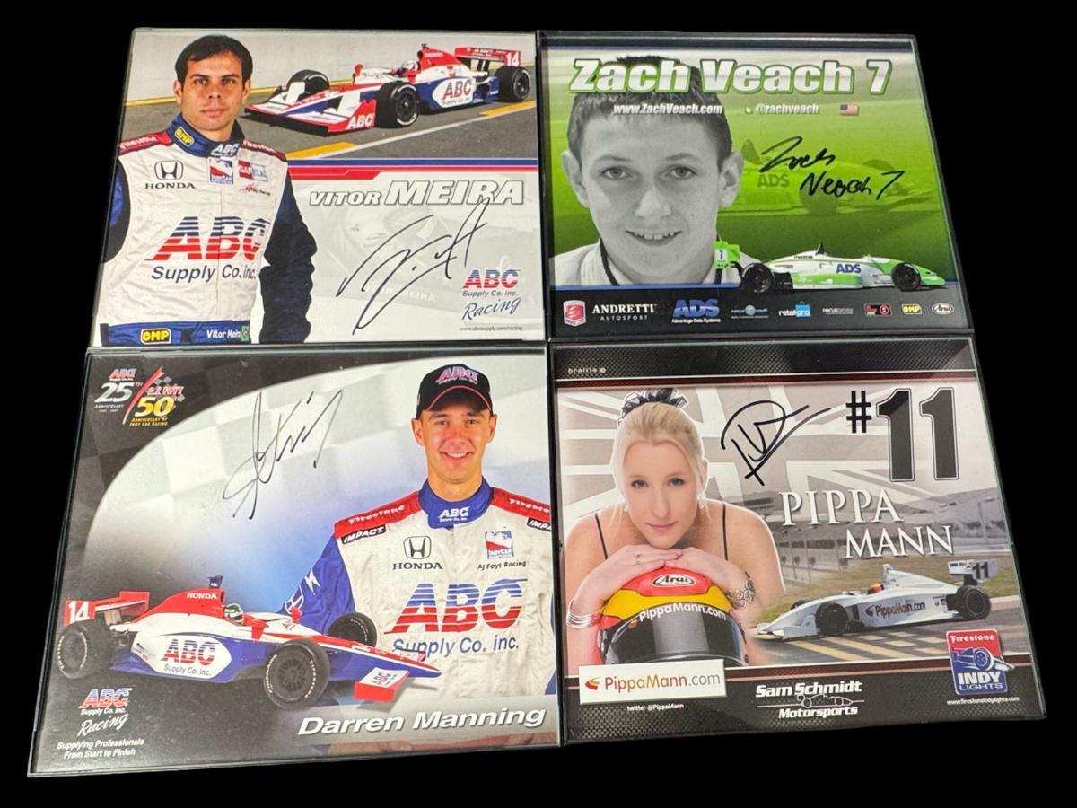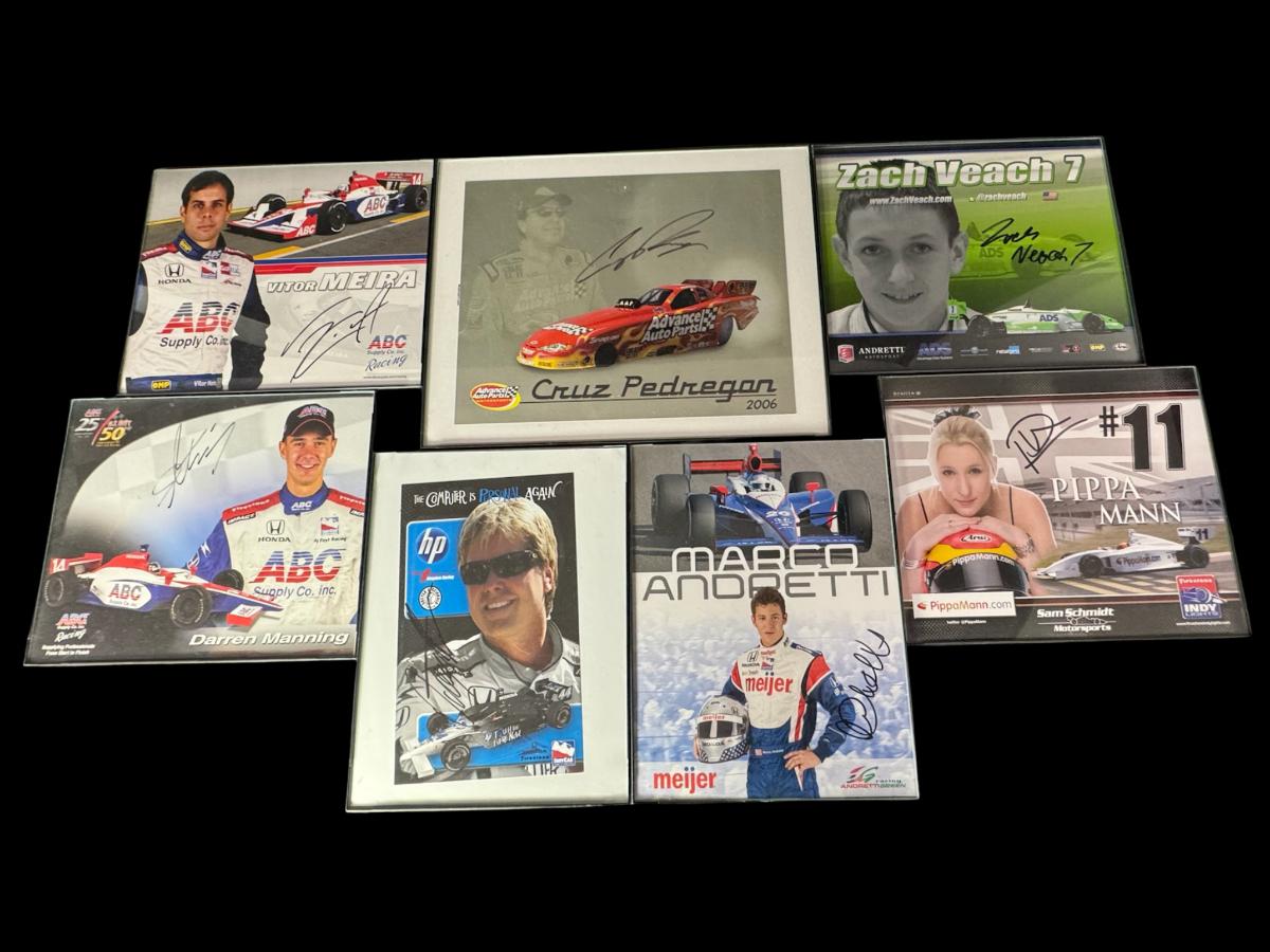 Includes the autographs of Victor Meira, Cruz Pedregon, Marco Andretti, Pippa Mann, Zach Veach, Darren Manning, and more. Total of seven pieces. Autographs not authenticated. Pre-auction estimate: $100-$200.