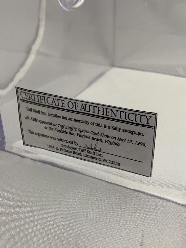 Autographed Jim Kelly Football. Autograph obtained at a Tuff Stuff event on 5/12/96.