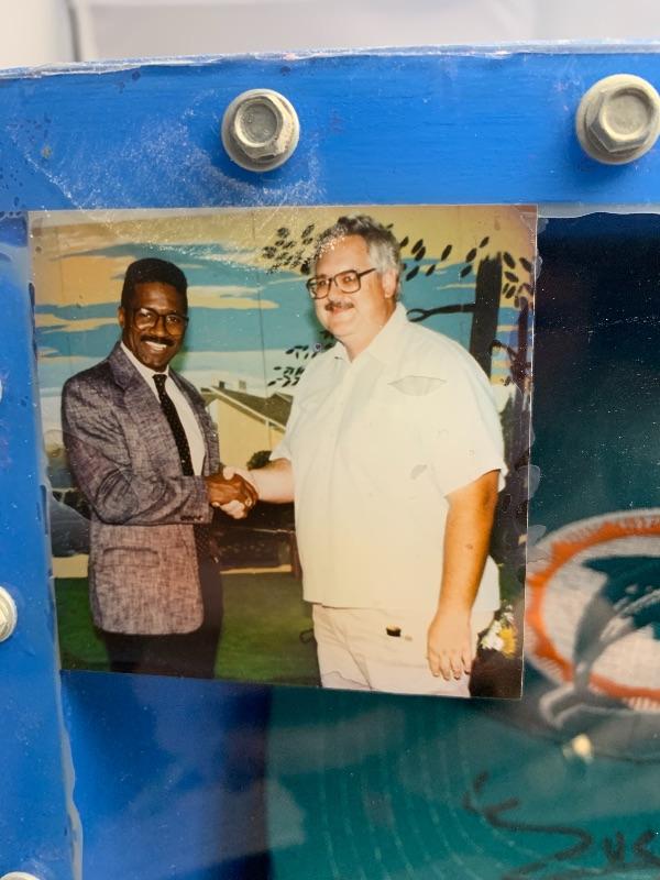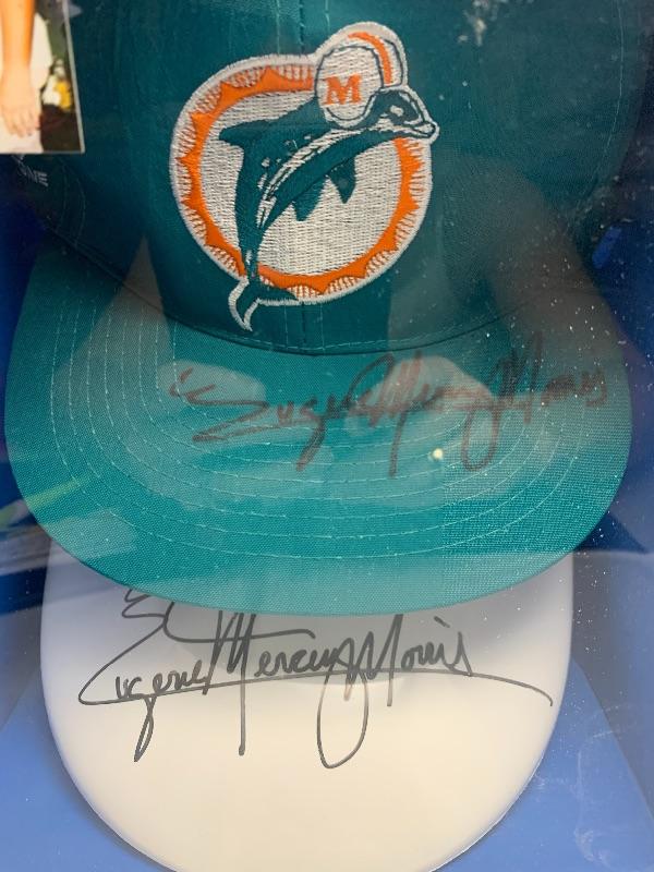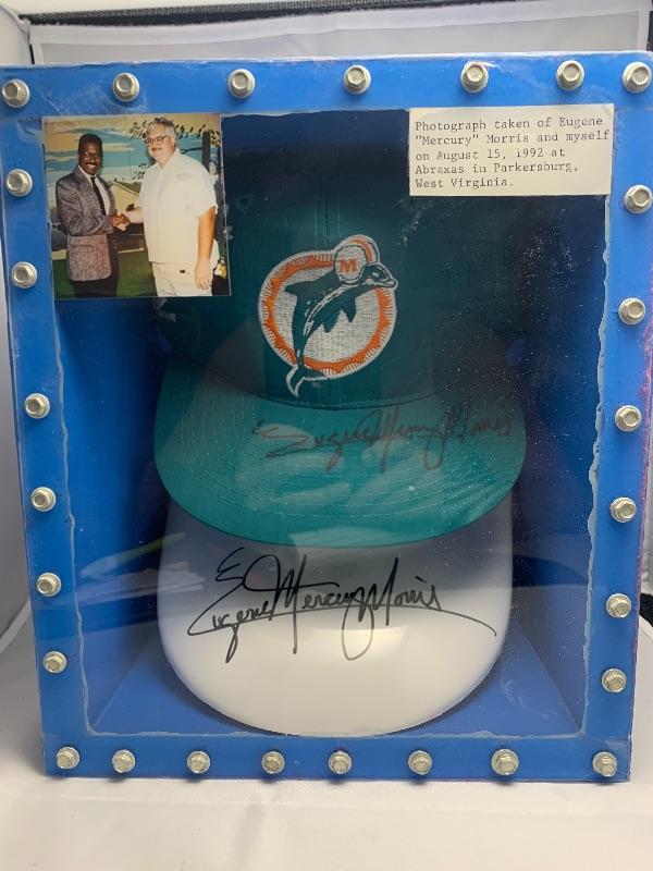 Autographed Mercury Morris Hat & Visor. Autograph obtained at Abraxas in Parkersburg WV. The picture included is of my late client with Mercury Morris. Comes in a homemade incapsulated case.