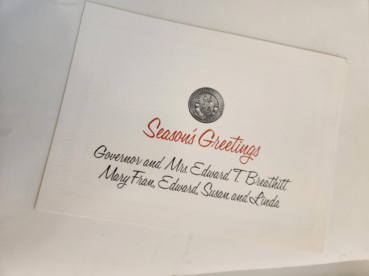 This auction lot is for an Autographed Photograph of Kentucky Governor Edward T. Breathitt, Jr. Plus a Christmas Card sent by the family during the term of his governorship.