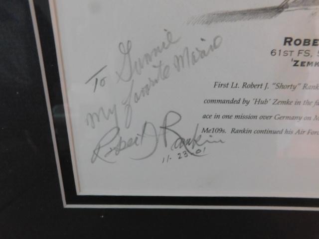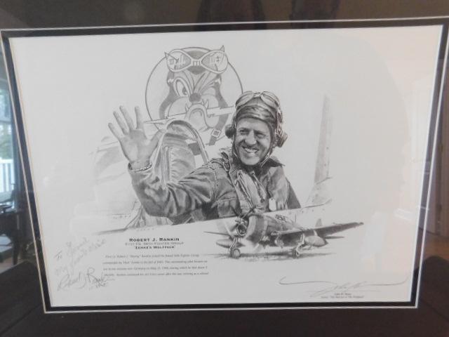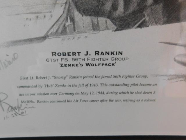 Autographed Print of Colonel Robert Rankin WWII American Ace of Famed "Zemke's Wolfpack' by John D. Shaw. Pilot was in same dog fight with Ace Gunther Rall as depicted in the previous lot The Warrior and the Wolfpack. Rankin was a Brevard, NC resident.