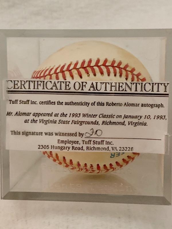 Authentic Autographed Roberto Alomar Baseball. Autograph obtained at a Tuff Stuff event on 1/10/1993.