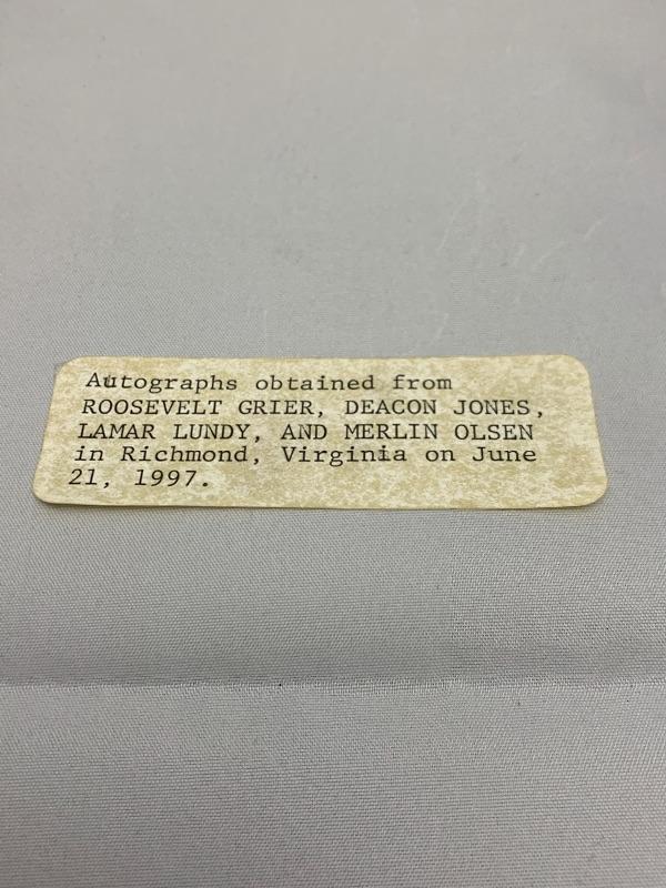 Autographed Roosevelt Grier, Deacon Jones, Lamar Lundy & Merlin Jones Football. Autograph obtained at an autograph event on 6/21/1997.