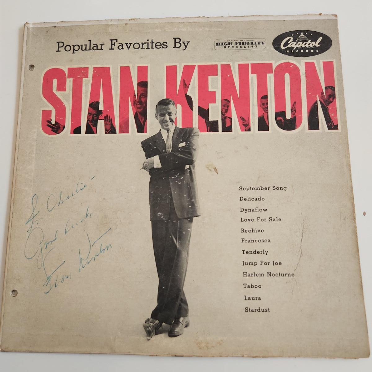 This auction lot is for an Autographed Stan Kenton Vinyl Record. The record appears to be in good condition but has not been played by us. The cardboard sleeve has seen some wear and has some edge splitting and aging to it. Given to our client who was a trombone player in a Jazz band.
