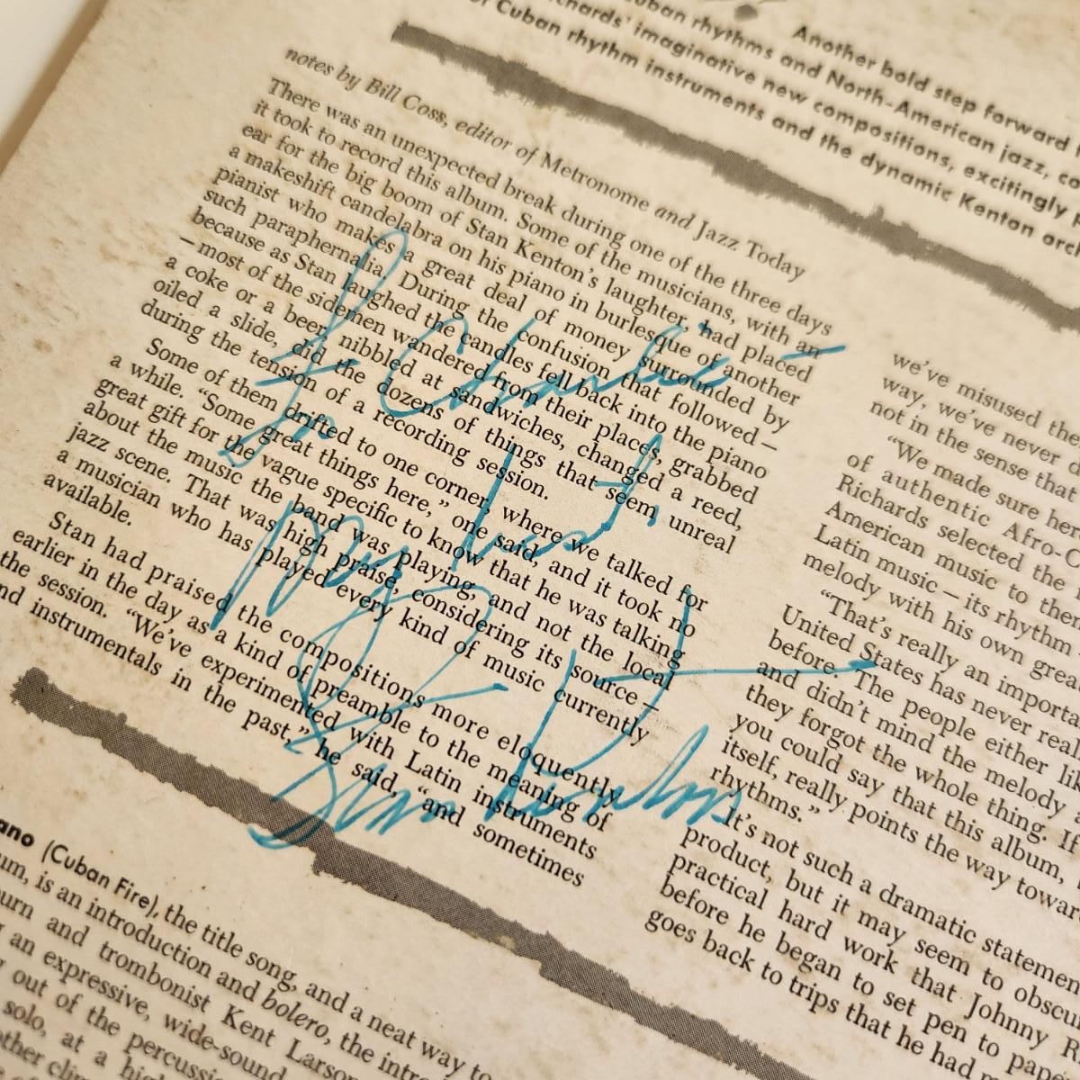 This auction lot is for an Autographed Stan Kenton Vinyl Record. The record appears to be in good condition but has not been played by us. The cardboard sleeve has seen some wear and has some edge aging to it. Given to our client who was a trombone player in a Jazz band.