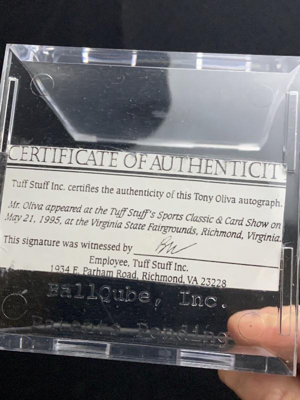 Authentic Autographed Tony Olivia Baseball. Autograph obtained at a Tuff Stuff event on 5/21/1995.