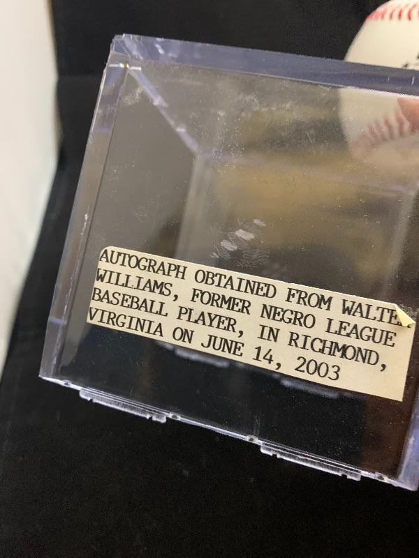 Authentic Autographed Walter Williams Baseball. Williams was a member of the Negro League. Autographed obtained at an event in Richmond VA on 6/14/2003.