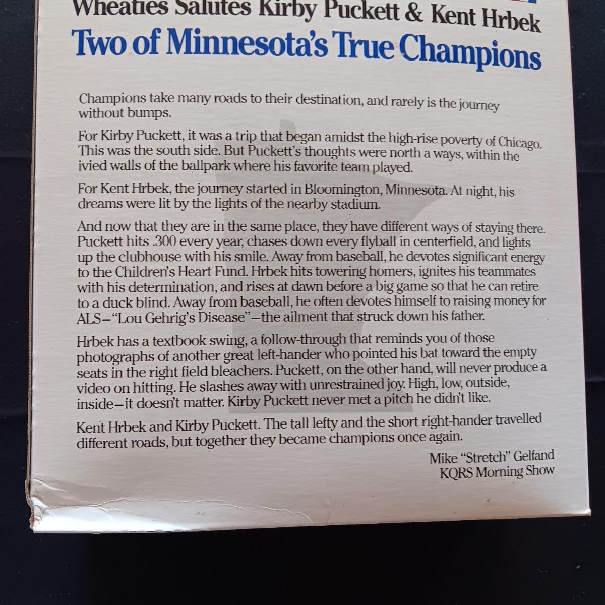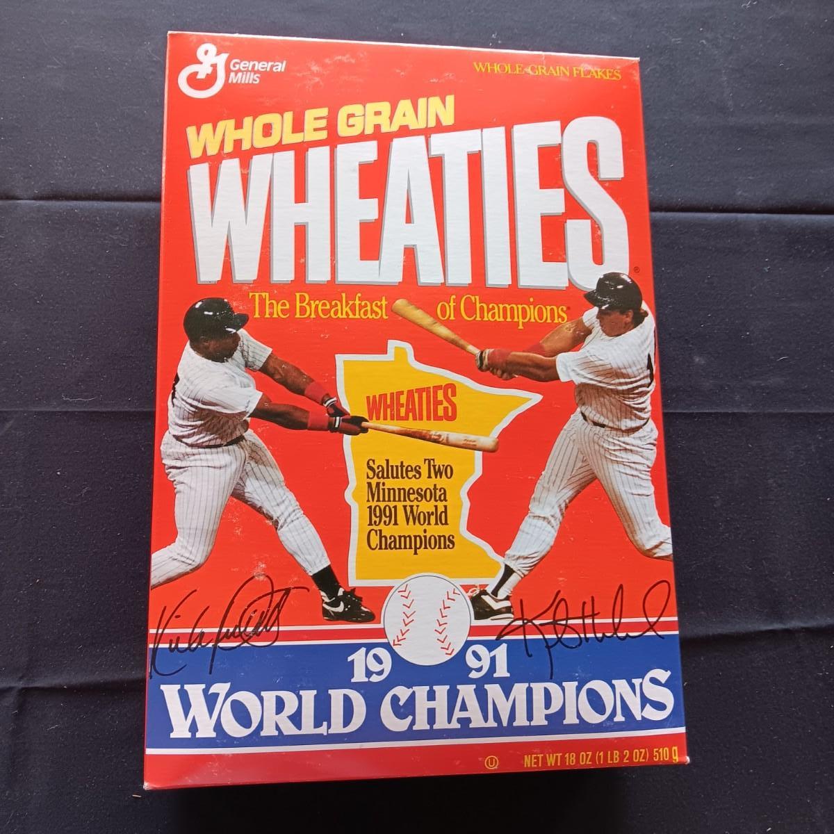 AUTOGRAPHED WHEATIES CEREAL BOX BY KIRBY PICKETT & KENT HRBEK