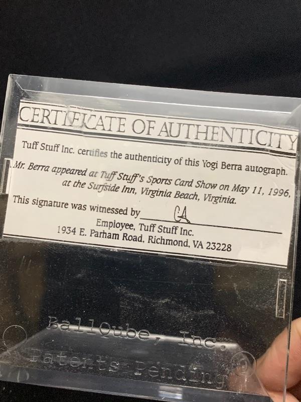 Authentic Autographed Baseball by Yogi Berra.. Autographed obtained at a Tuff Stuff event on 5/11/96.