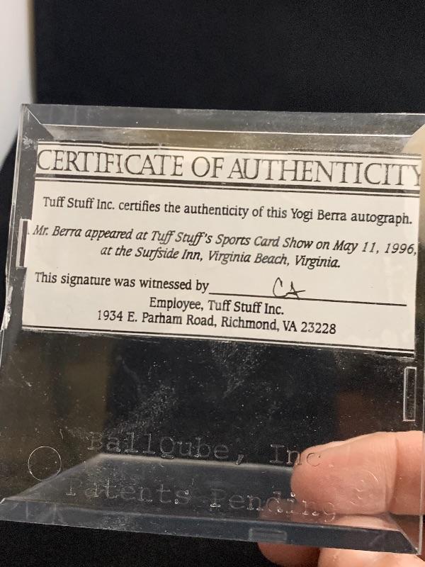 Authentic Autographed Baseball by Yogi Berra.. Autographed obtained at a Tuff Stuff event on 5/11/96.