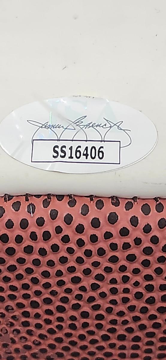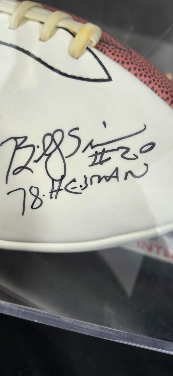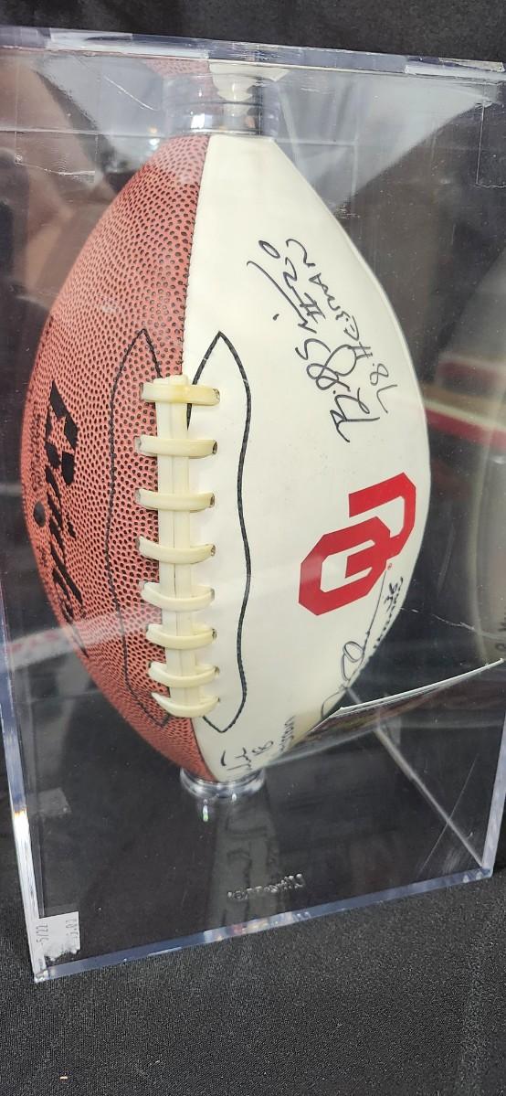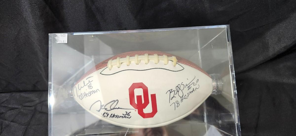 This is a signed Oklahoma Sooners Football signed by Heisman winners signed by Steve Owens/Heisman winner 1969, Billy Sims/Heisman winner 1978 and Jason White/Heisman winner 2003 . JSA Certification