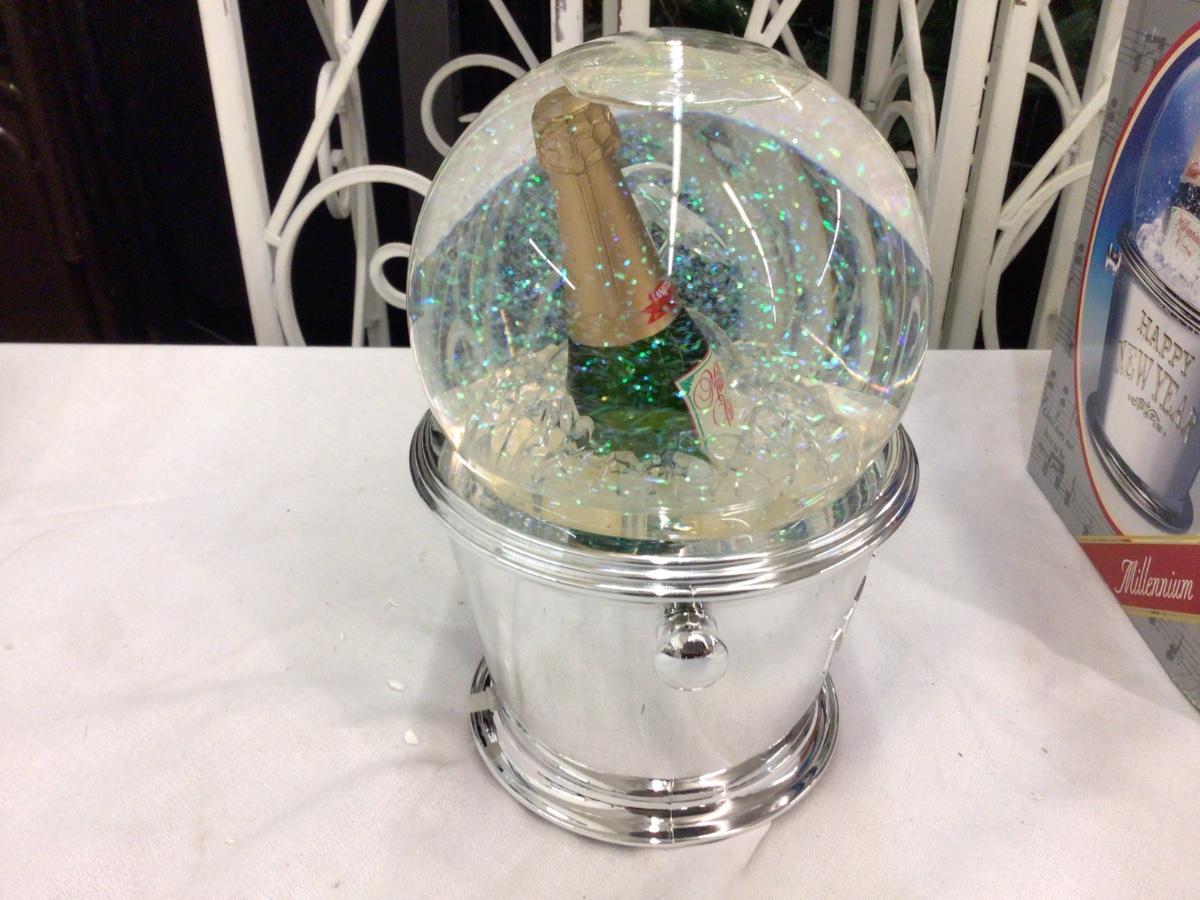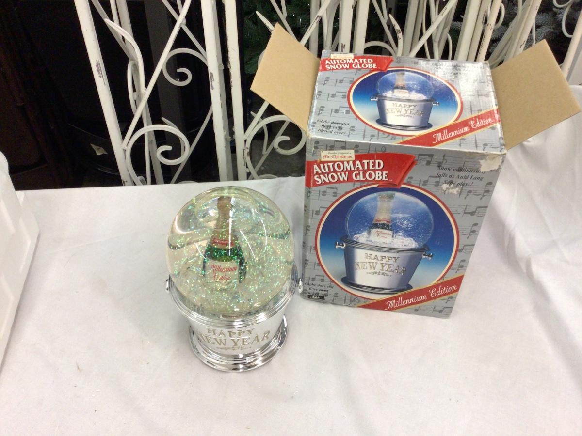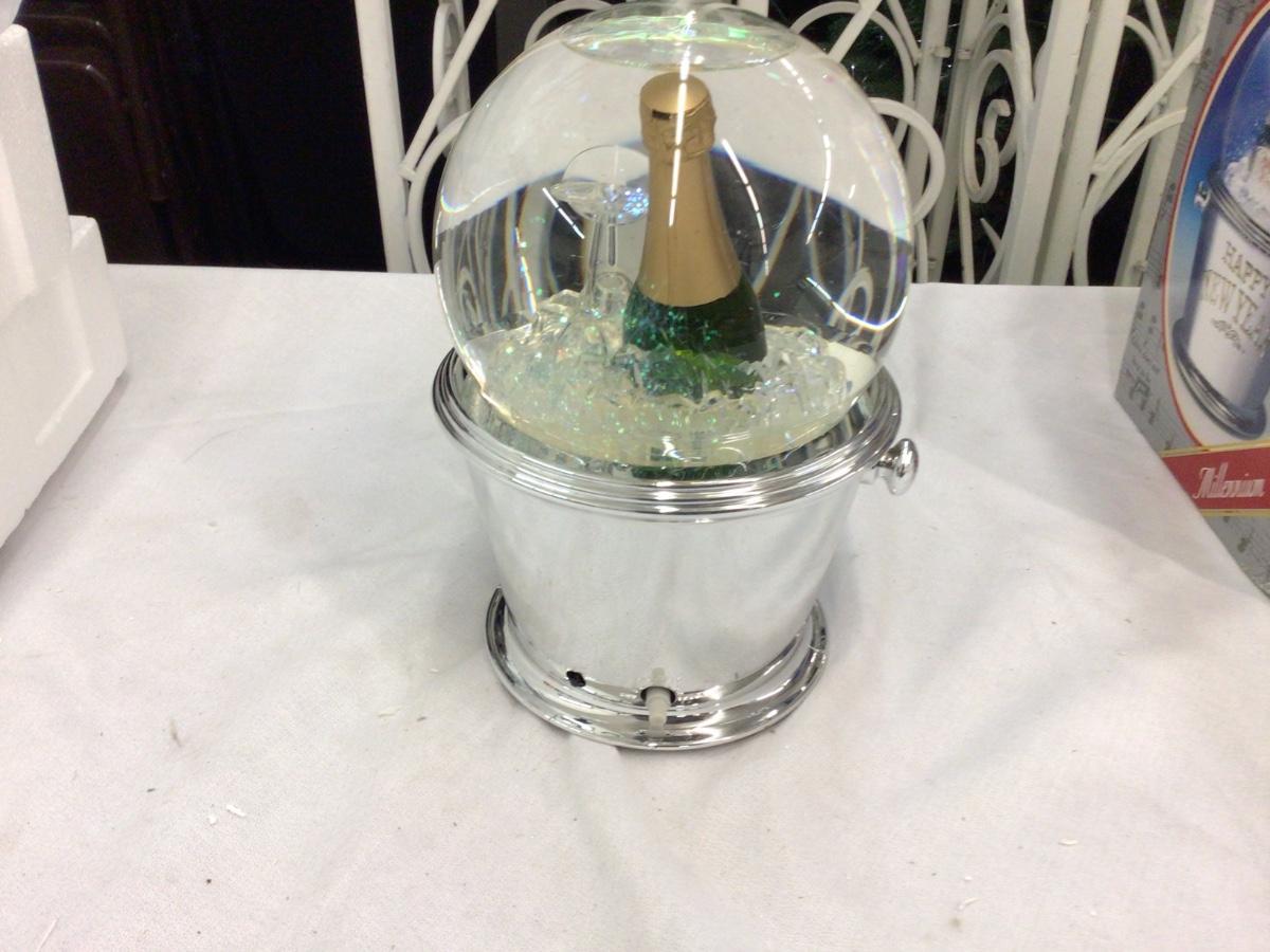 You get Automated snow globe Happy New Year. It plays happy new years and mixes glitter in the water around an ice bucket with Champaign in it. Has the box and does work.