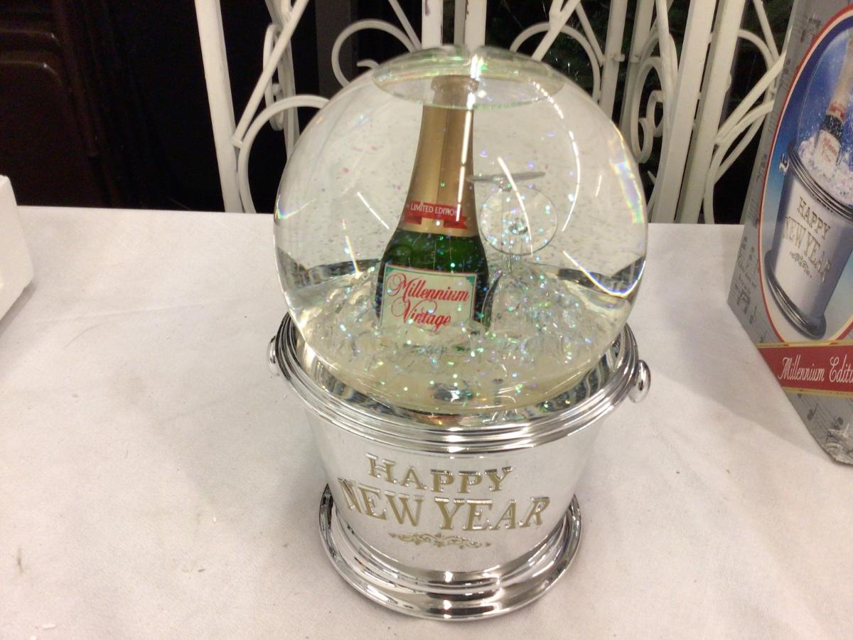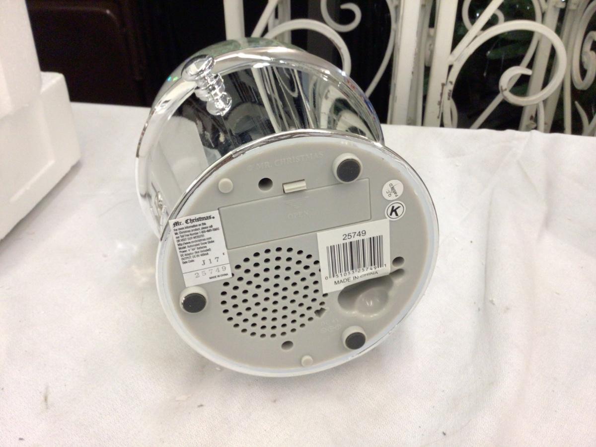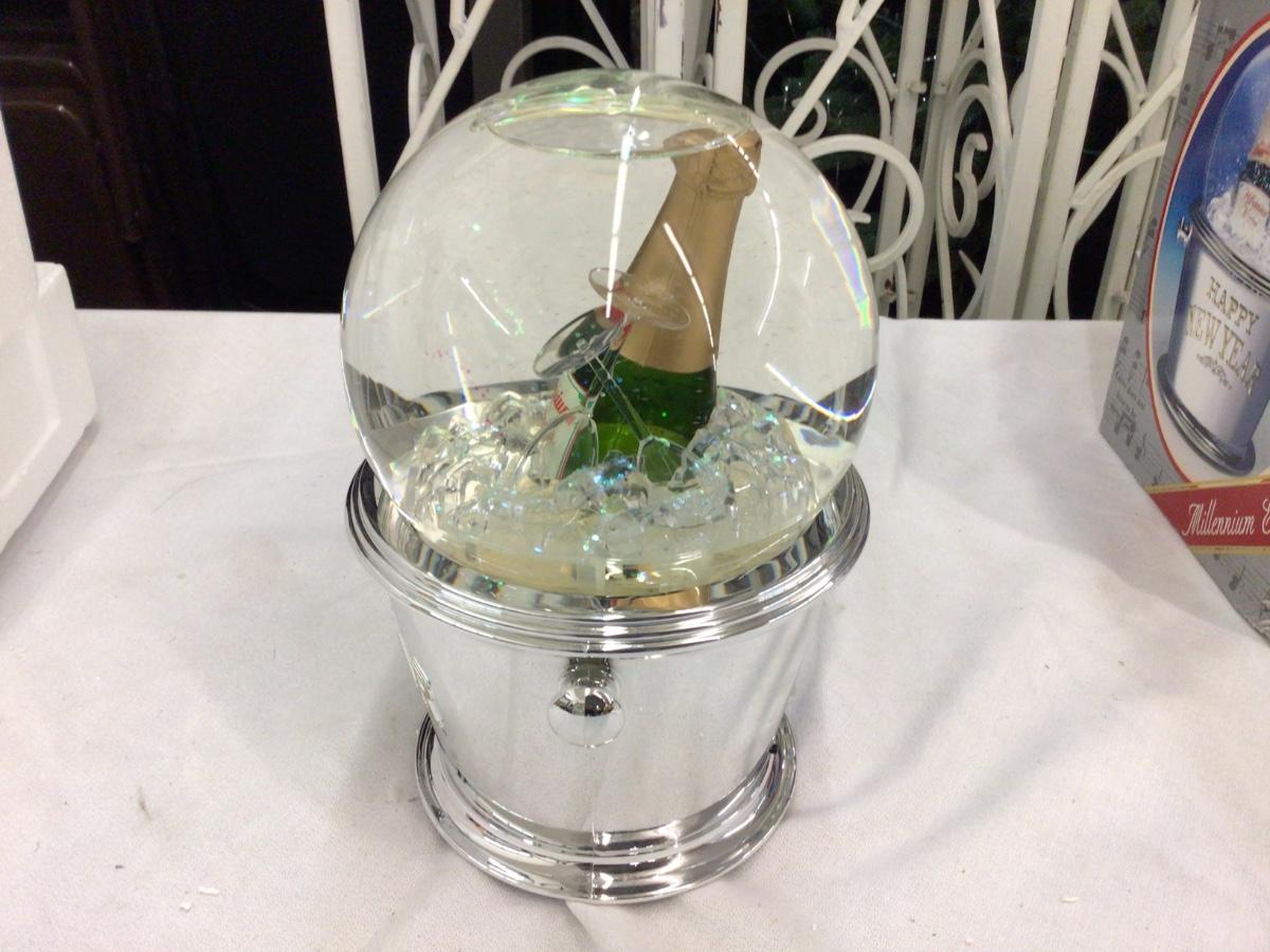 You get Automated snow globe Happy New Year. It plays happy new years and mixes glitter in the water around an ice bucket with Champaign in it. Has the box and does work.