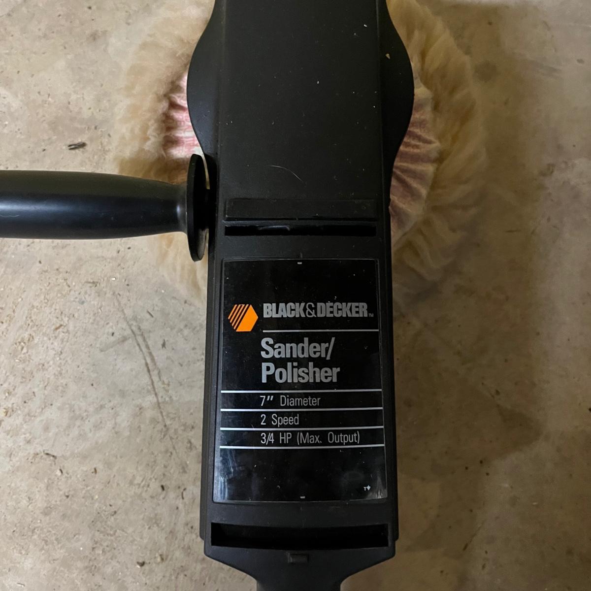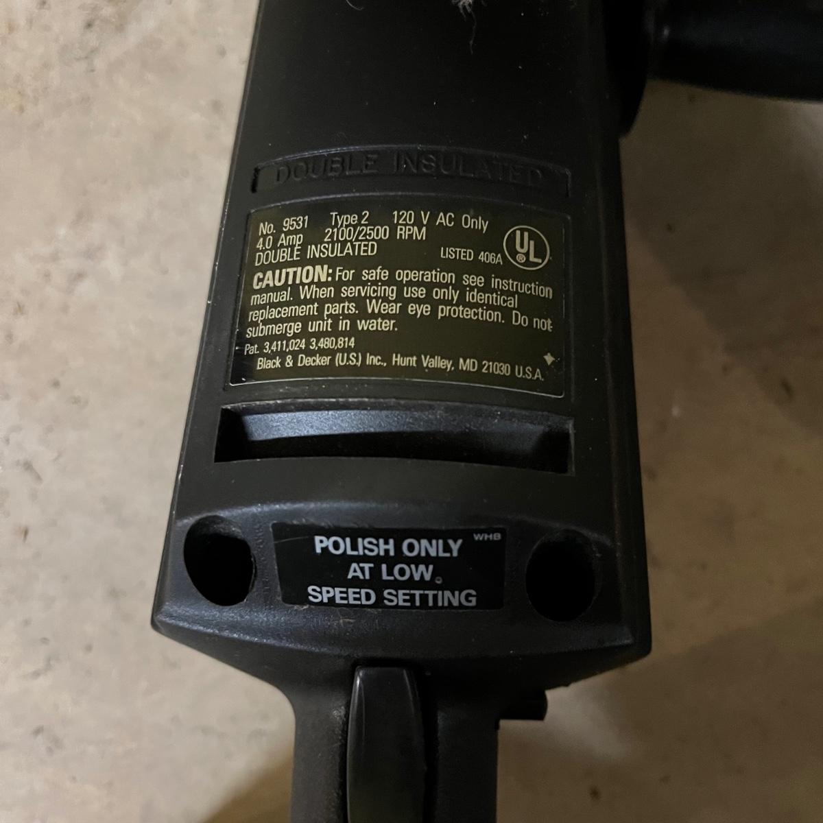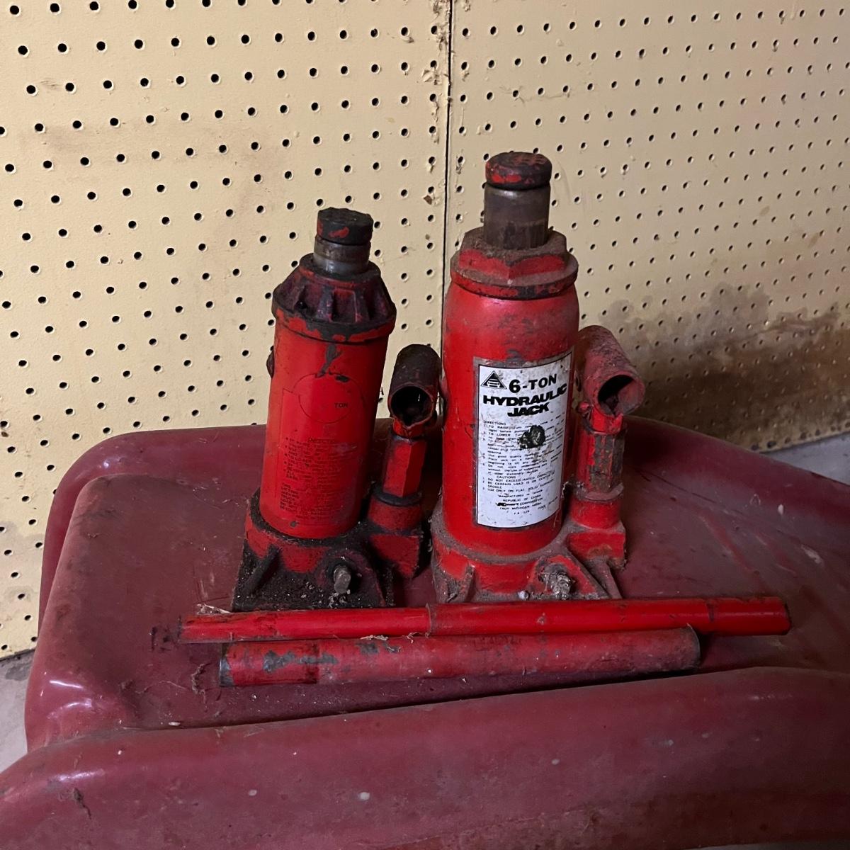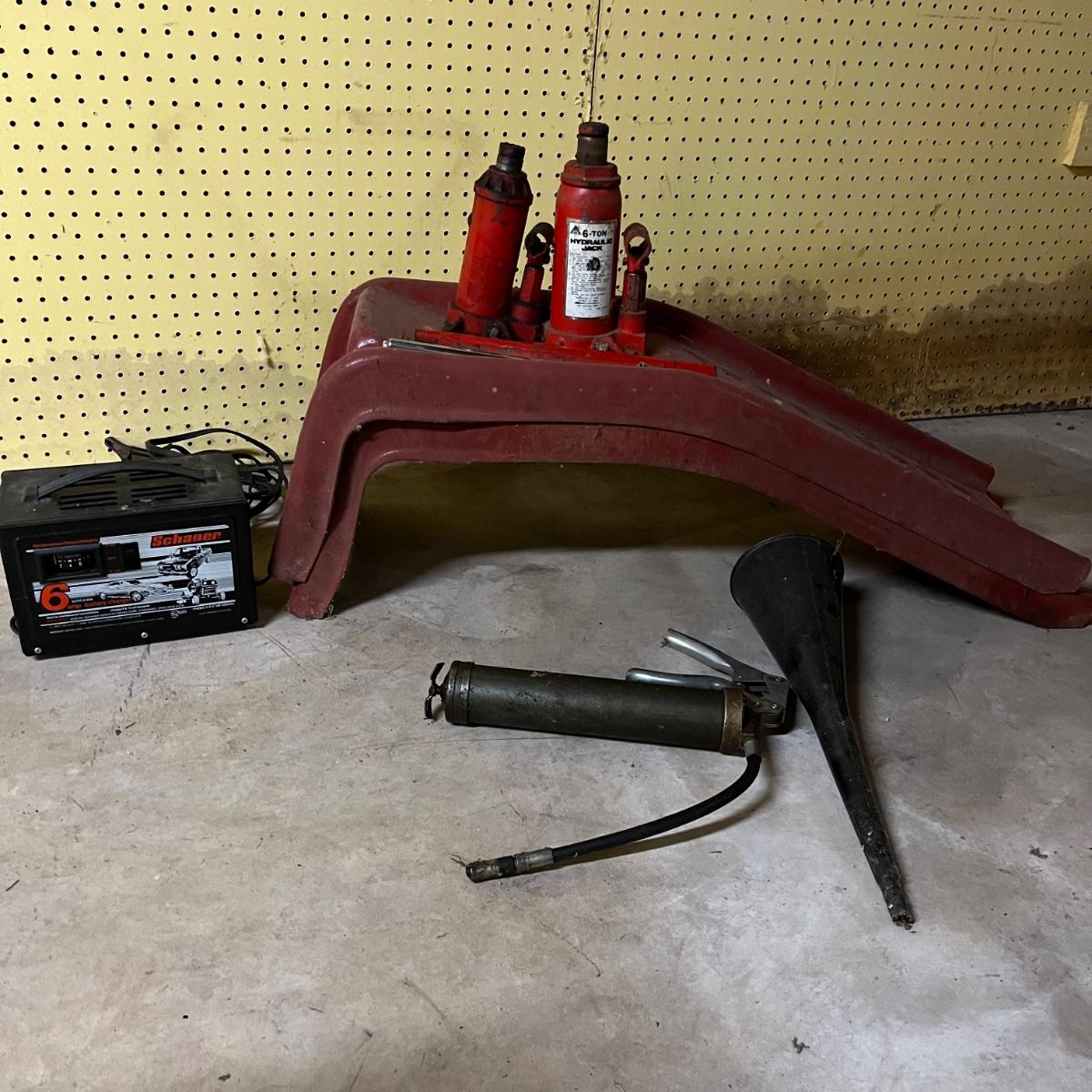 Lot includes a pair of metal Automobile ramps, Black and Decker 7”D polisher, Schauber battery charger, two bottle jacks, tire pressure gauge and a grease gun. Battery charger and polisher powered on when tested.
