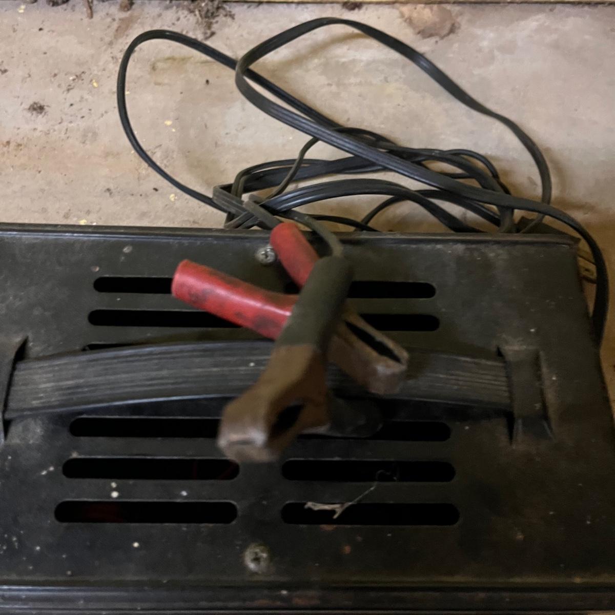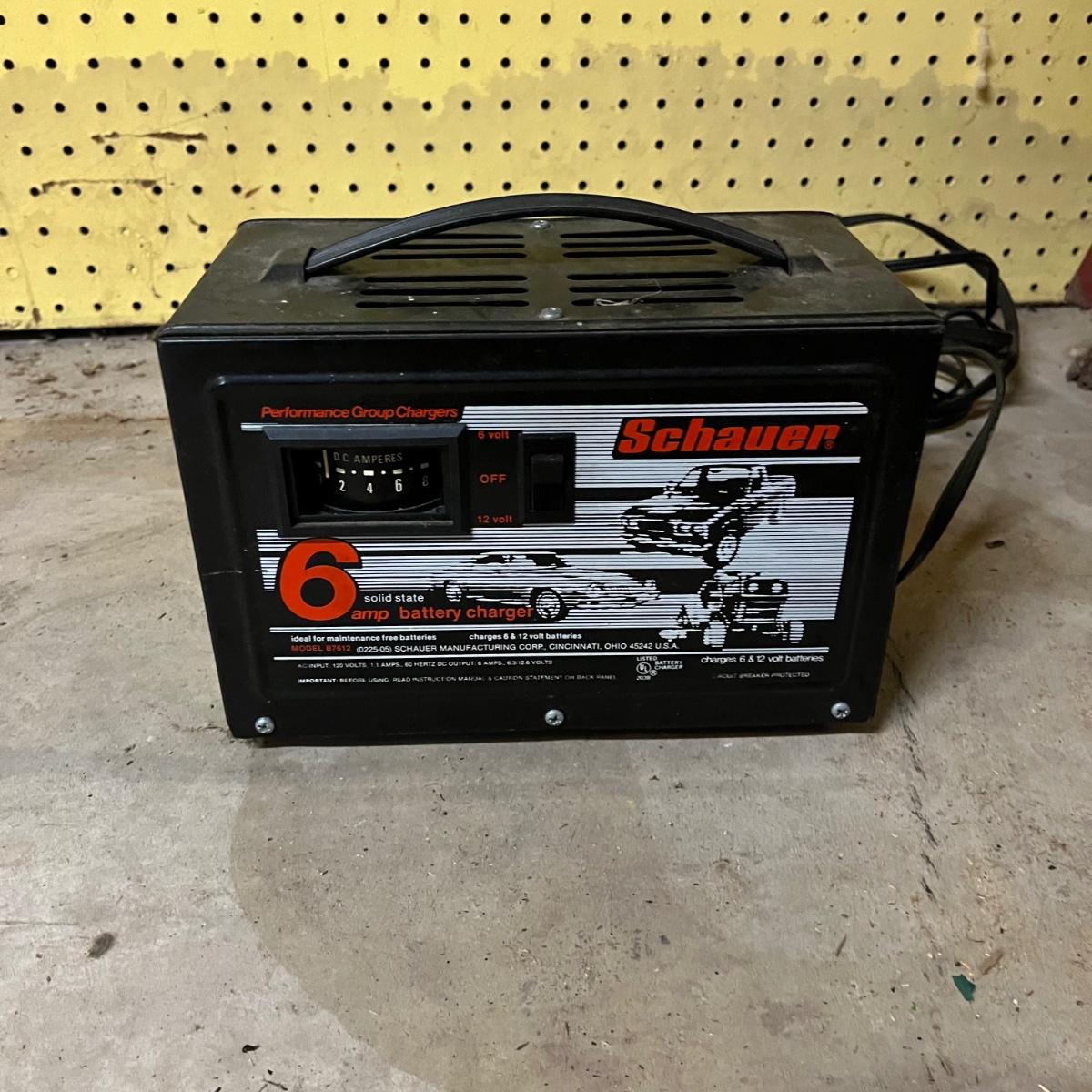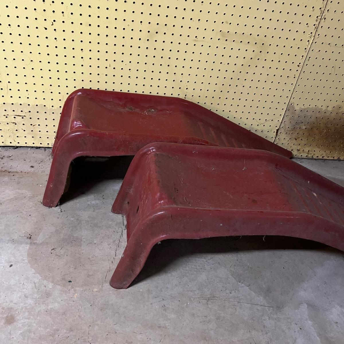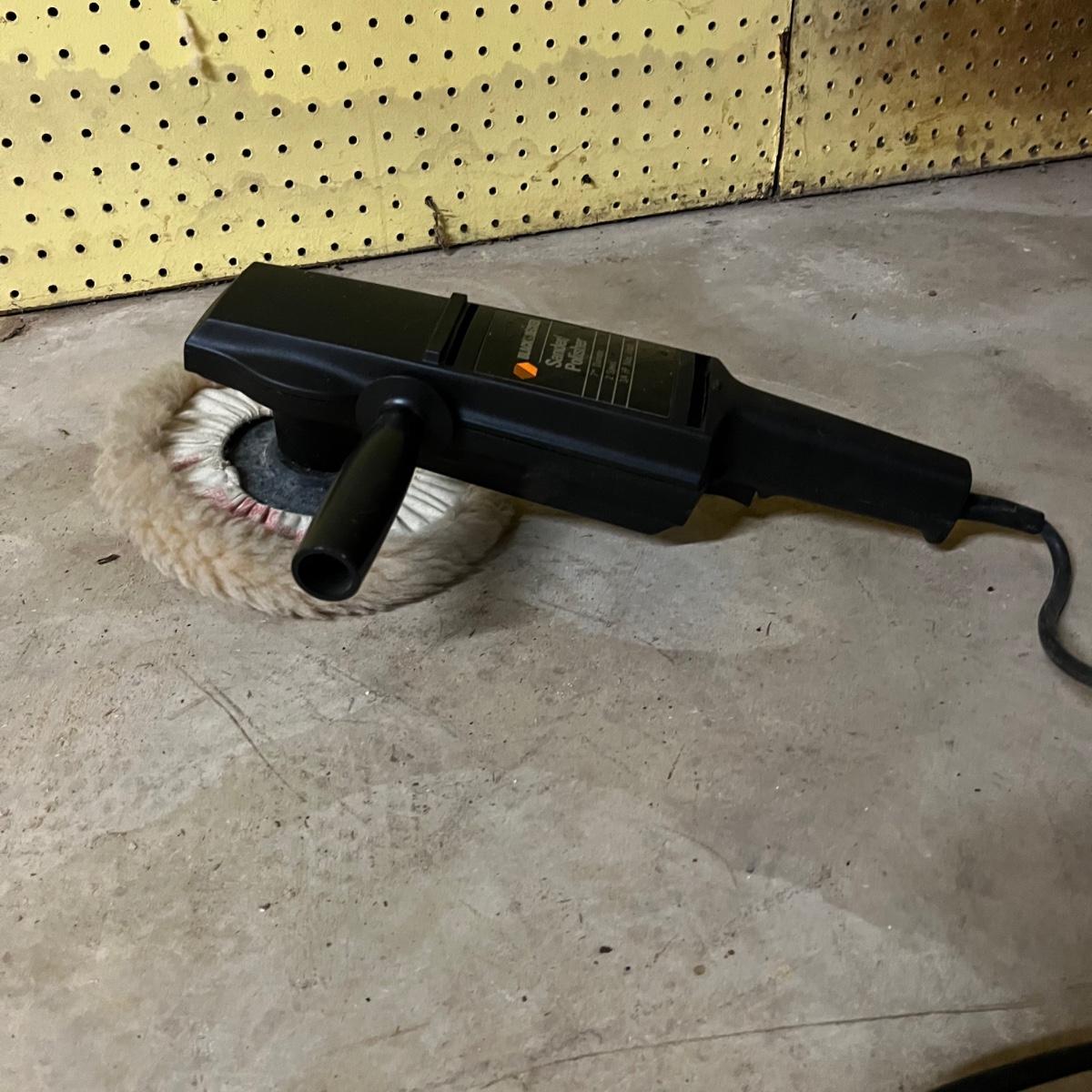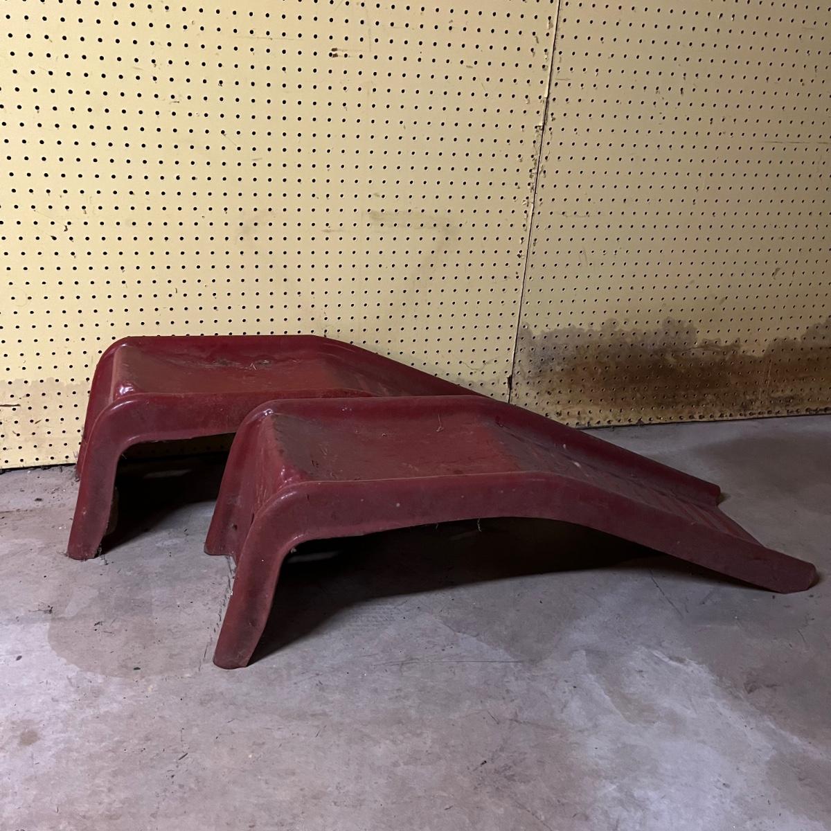 Lot includes a pair of metal Automobile ramps, Black and Decker 7”D polisher, Schauber battery charger, two bottle jacks, tire pressure gauge and a grease gun. Battery charger and polisher powered on when tested.