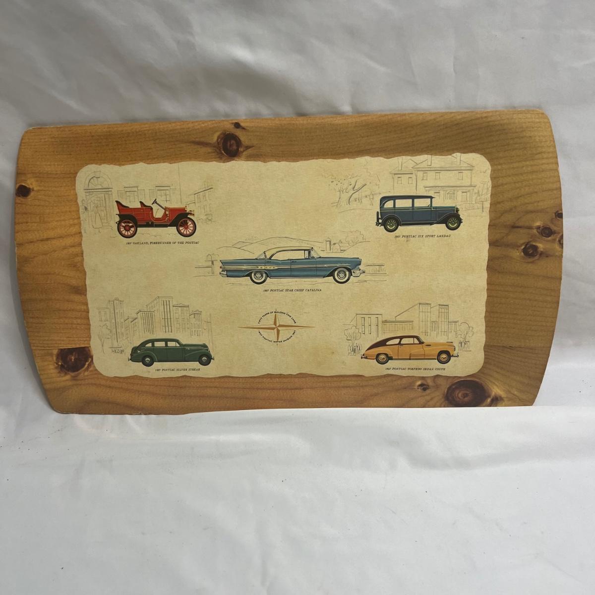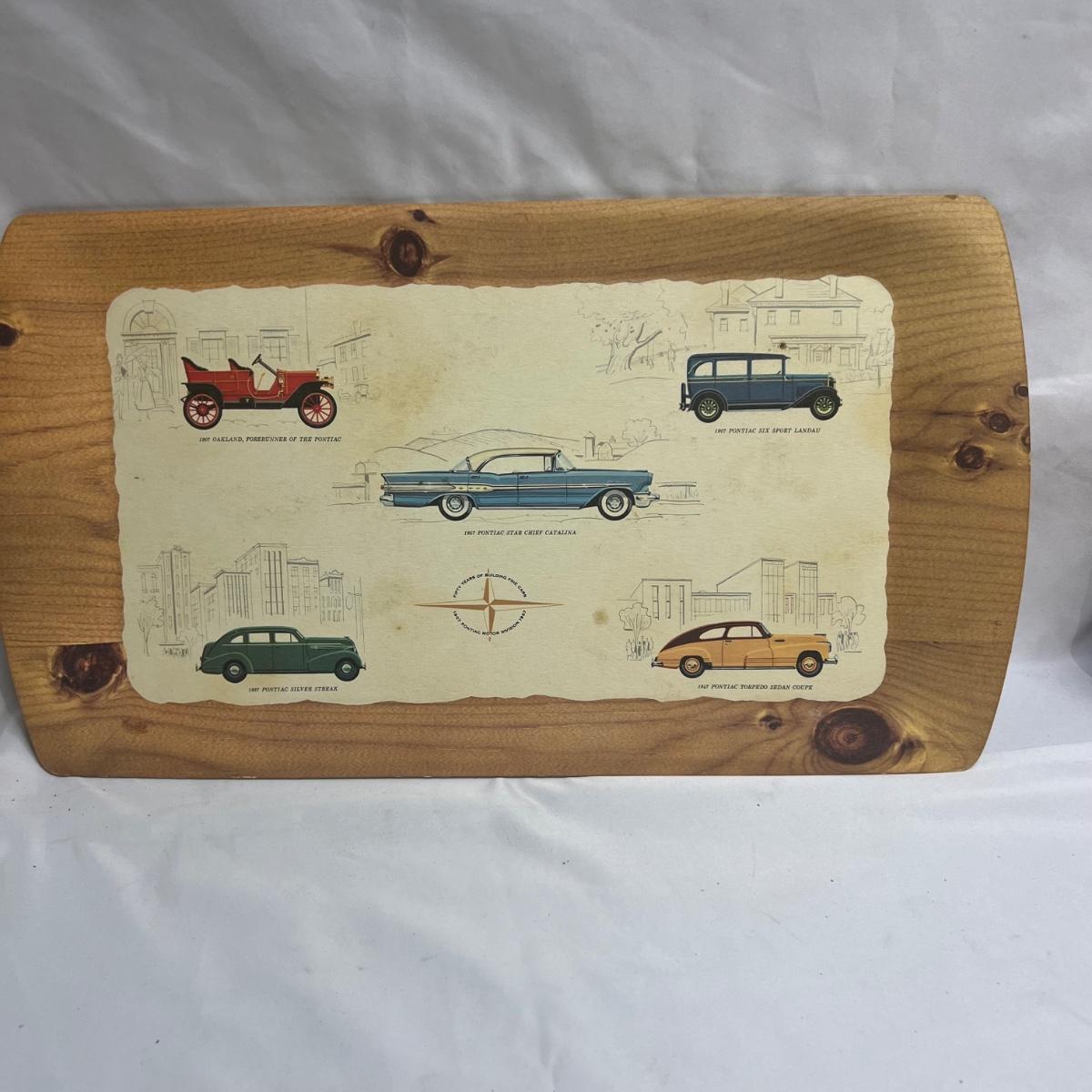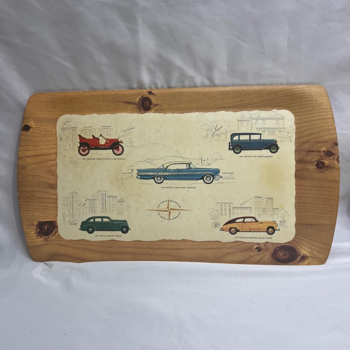 Vintage Ford wheel and cap hub measures 2”D x 2”H. Packard motor car thermometer measures 8.5" x 27” x 1”H. Three wooden trays with images of various vintage cars, each measure 18” x 0.5” x 10”H.