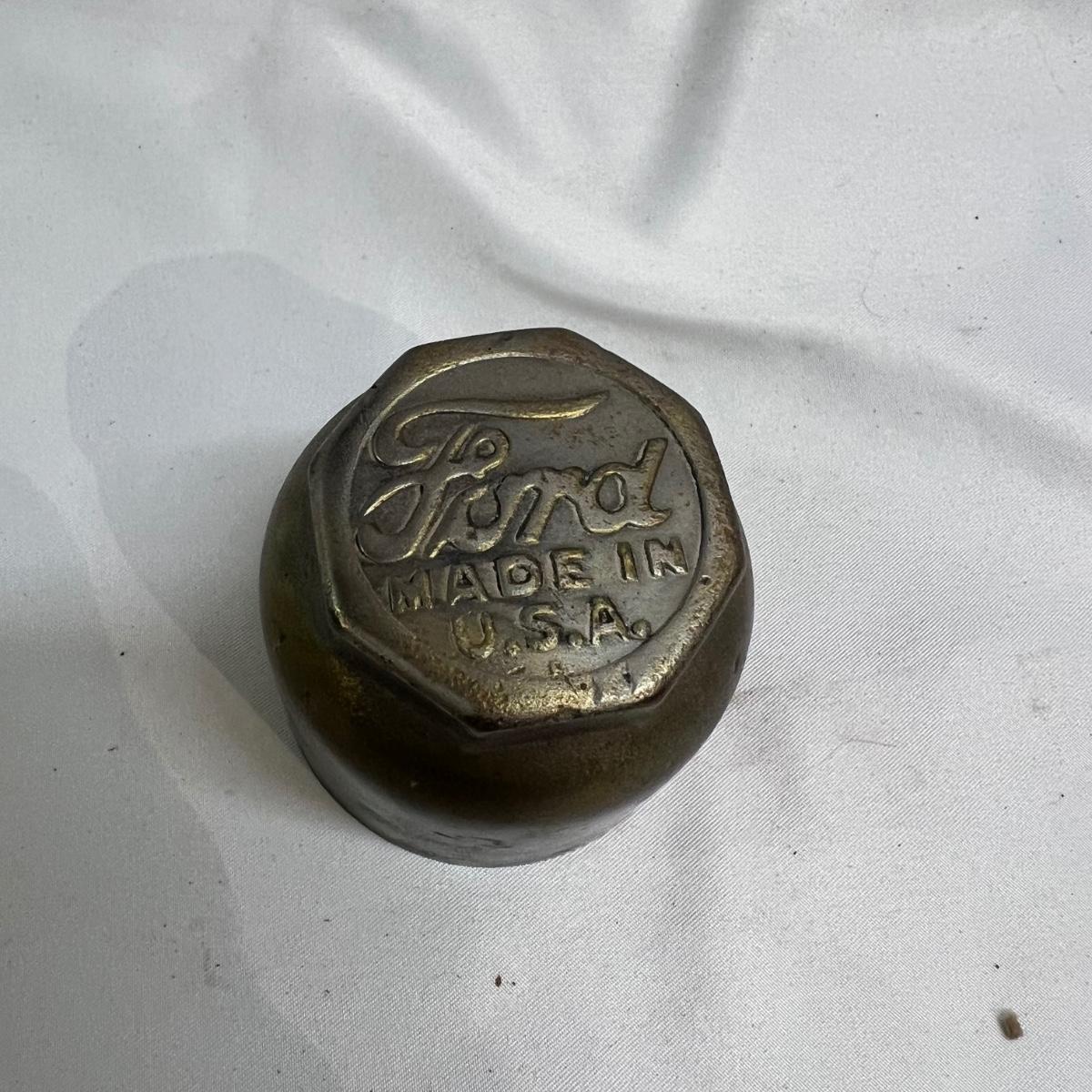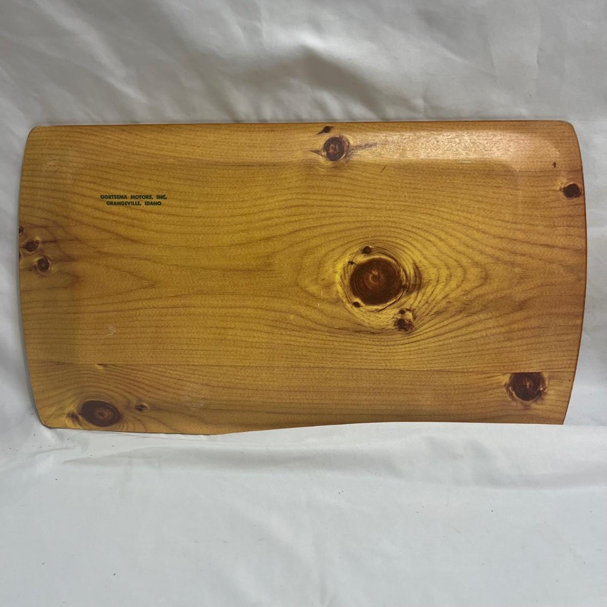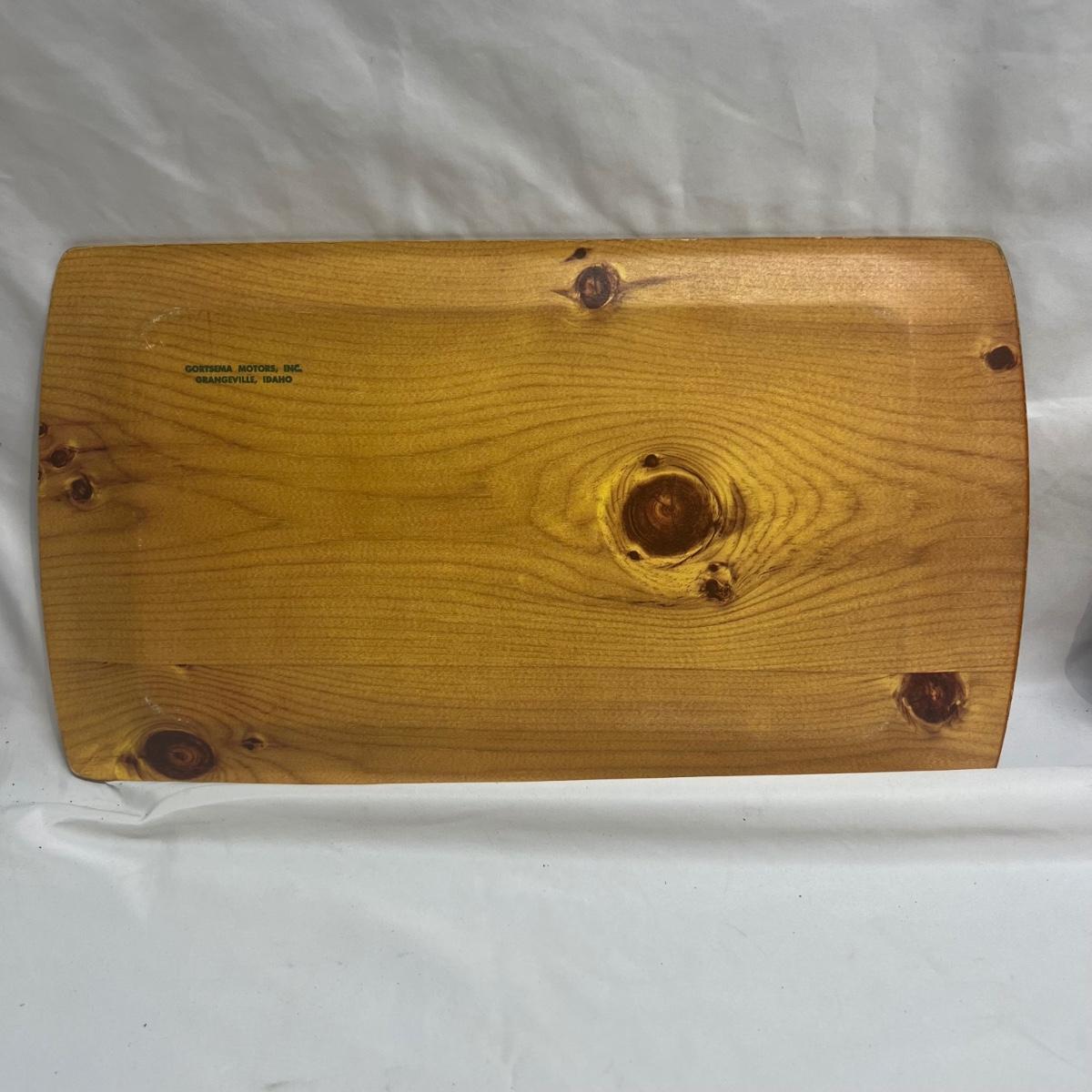 Vintage Ford wheel and cap hub measures 2”D x 2”H. Packard motor car thermometer measures 8.5" x 27” x 1”H. Three wooden trays with images of various vintage cars, each measure 18” x 0.5” x 10”H.