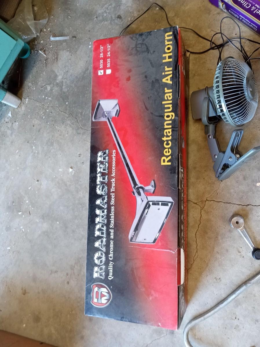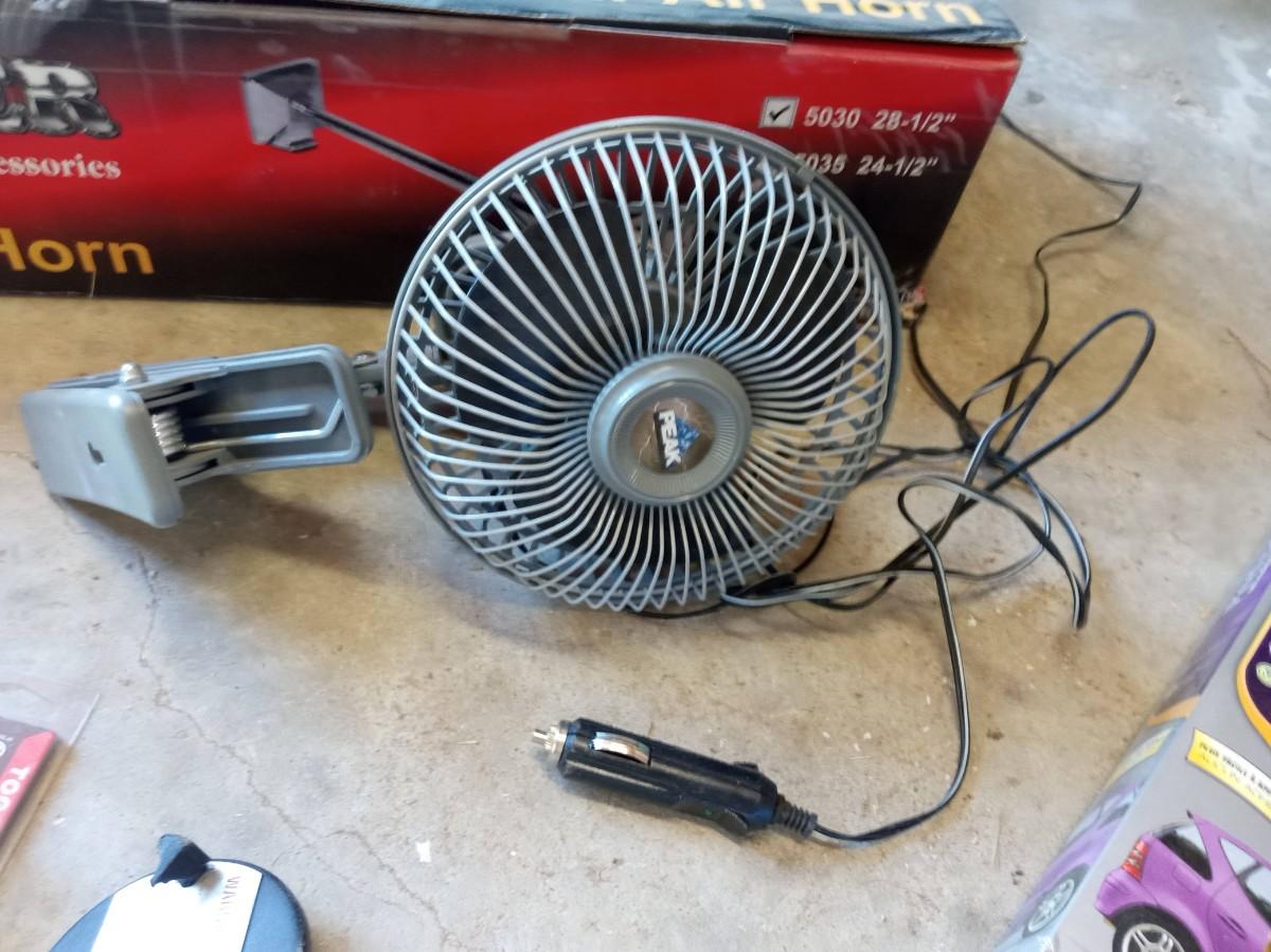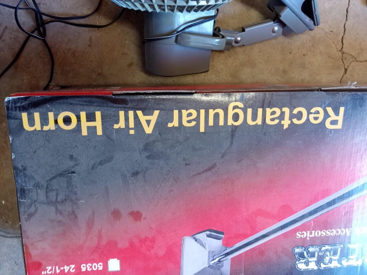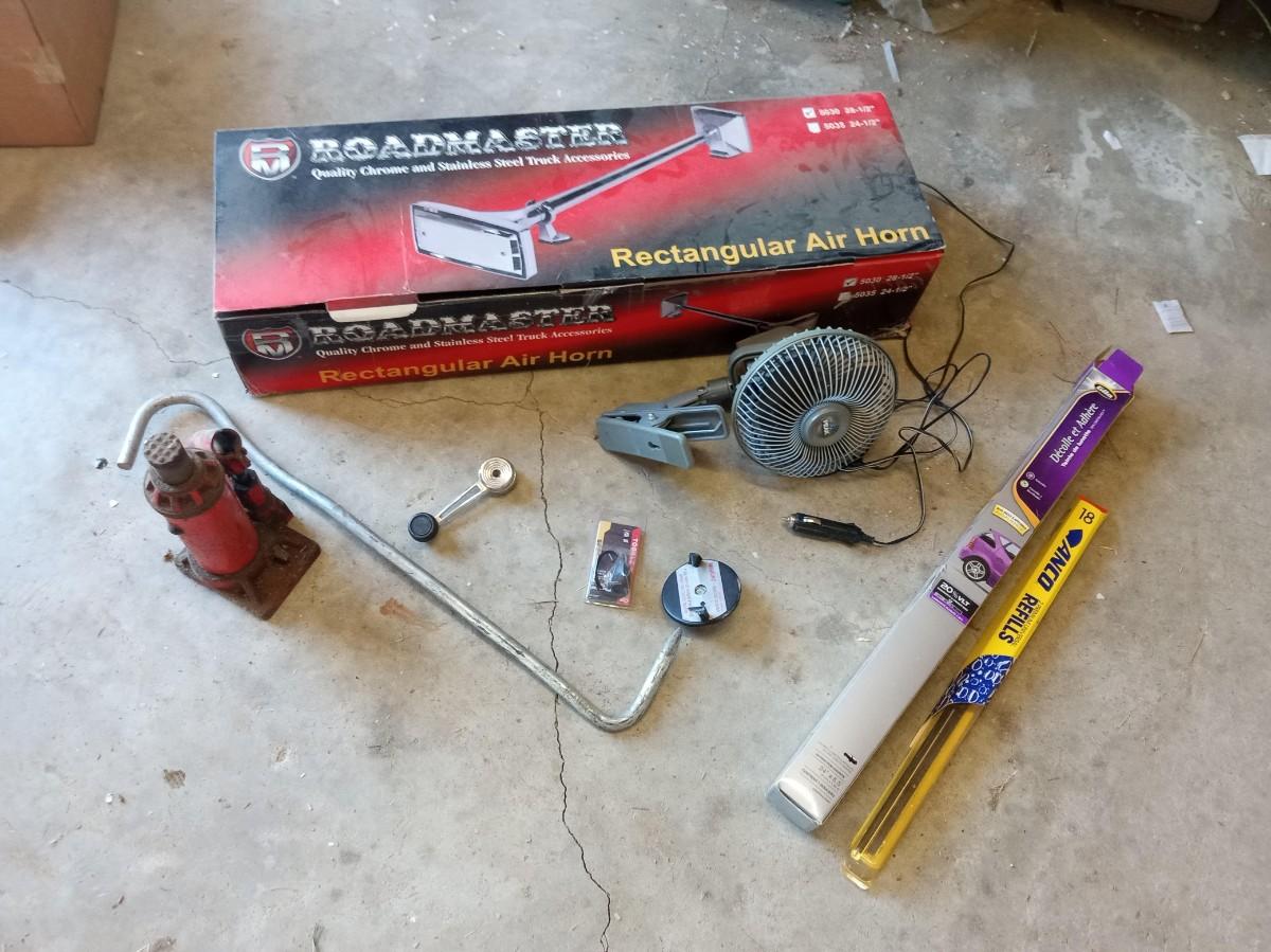 NEW ROADMASTER RECTANGULAR AIR HORN, BOTTLE JACK W/NO HANDLE, AUTO FAN, ETC