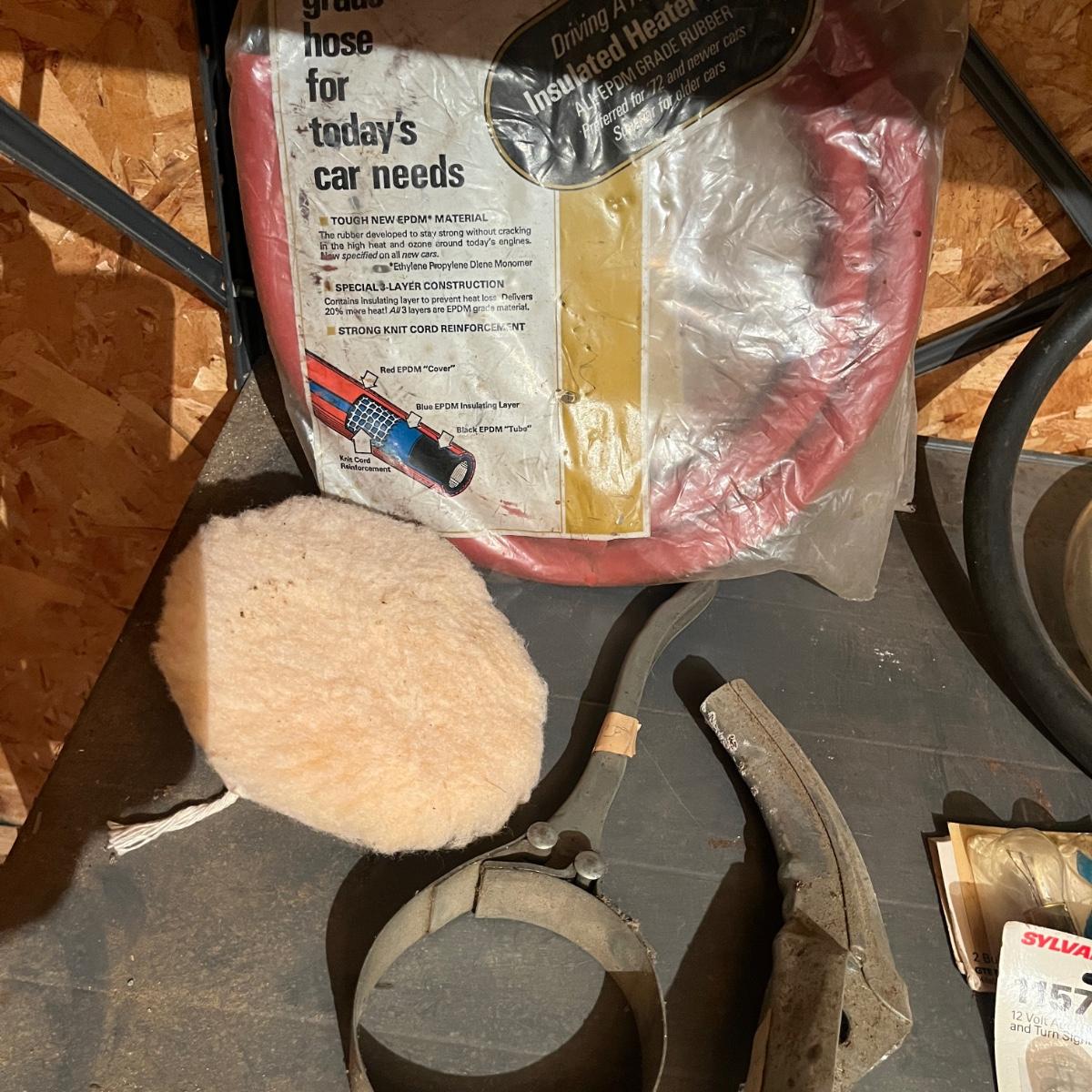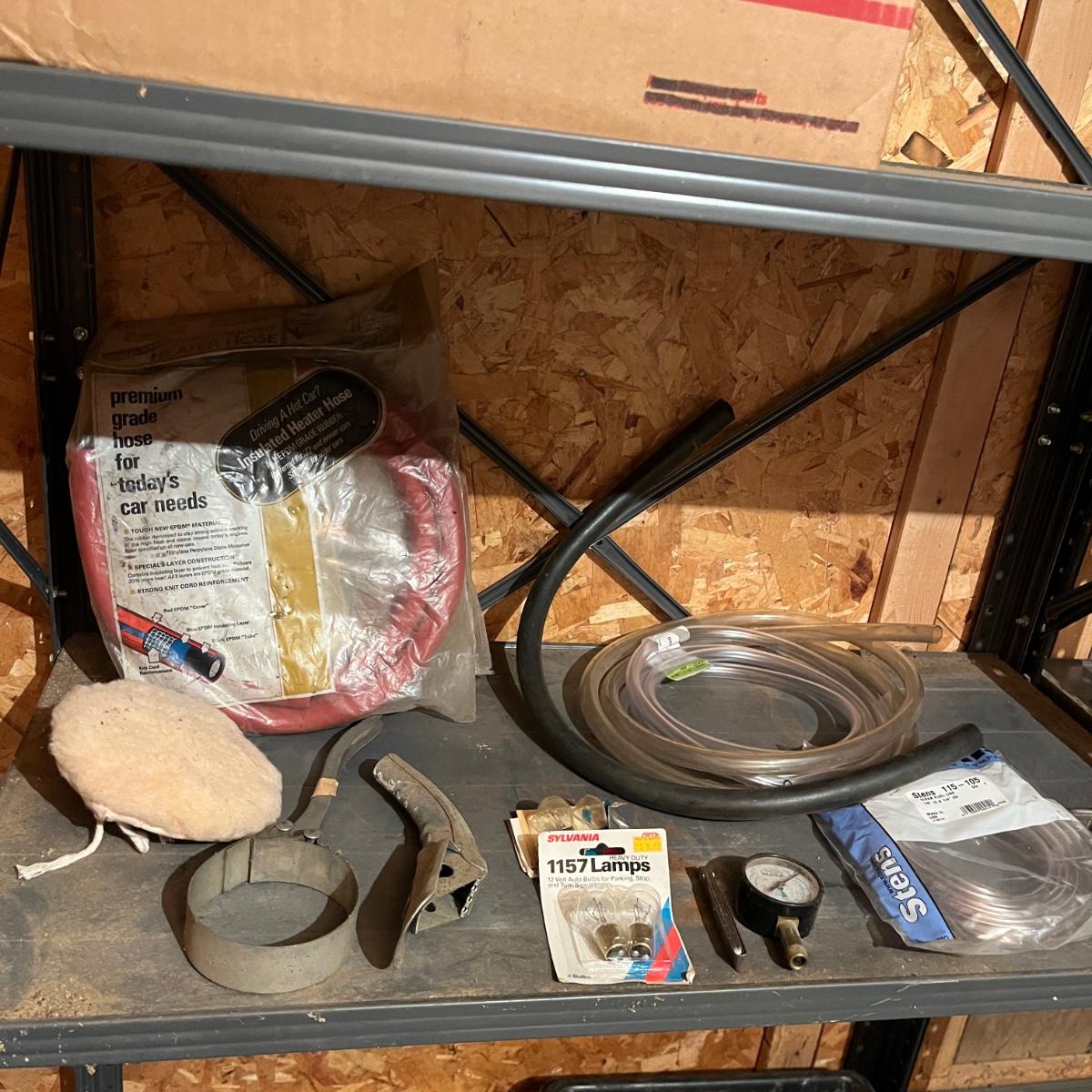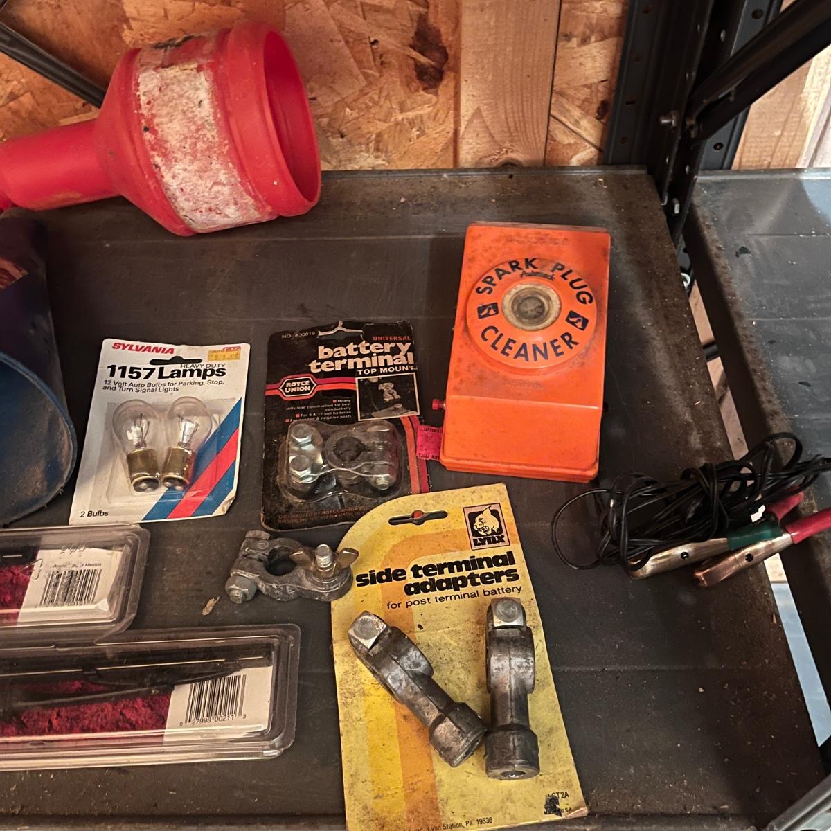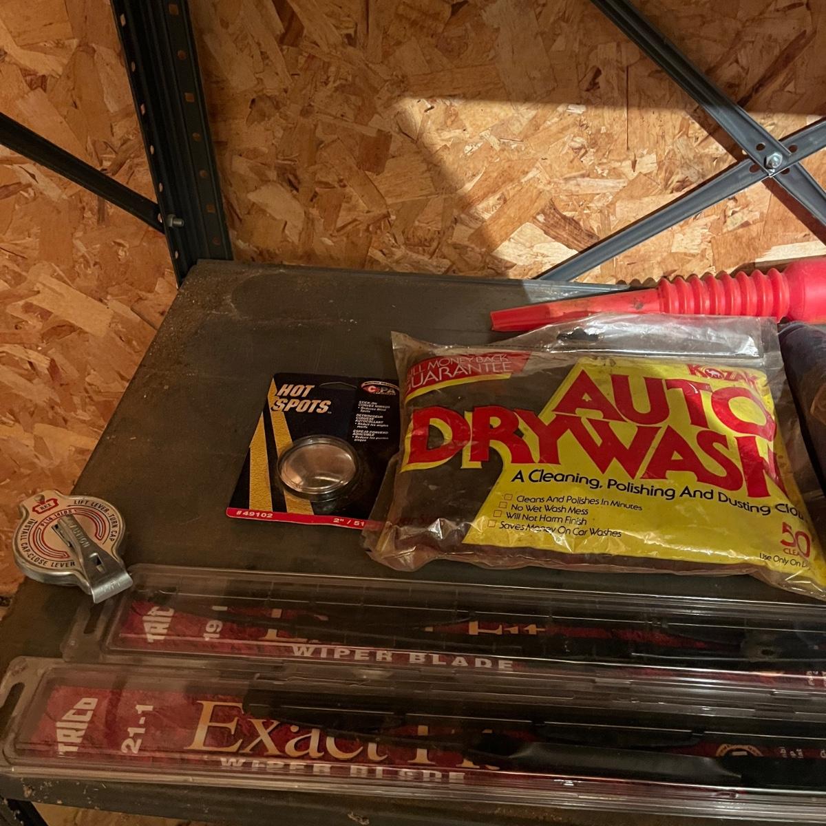 Lot includes Michelin car wash kit , spark plug cleaner, four ton bottle jack, wiper blades, battery terminals, funnels, drain pans, heater hoses, oil cans and more.