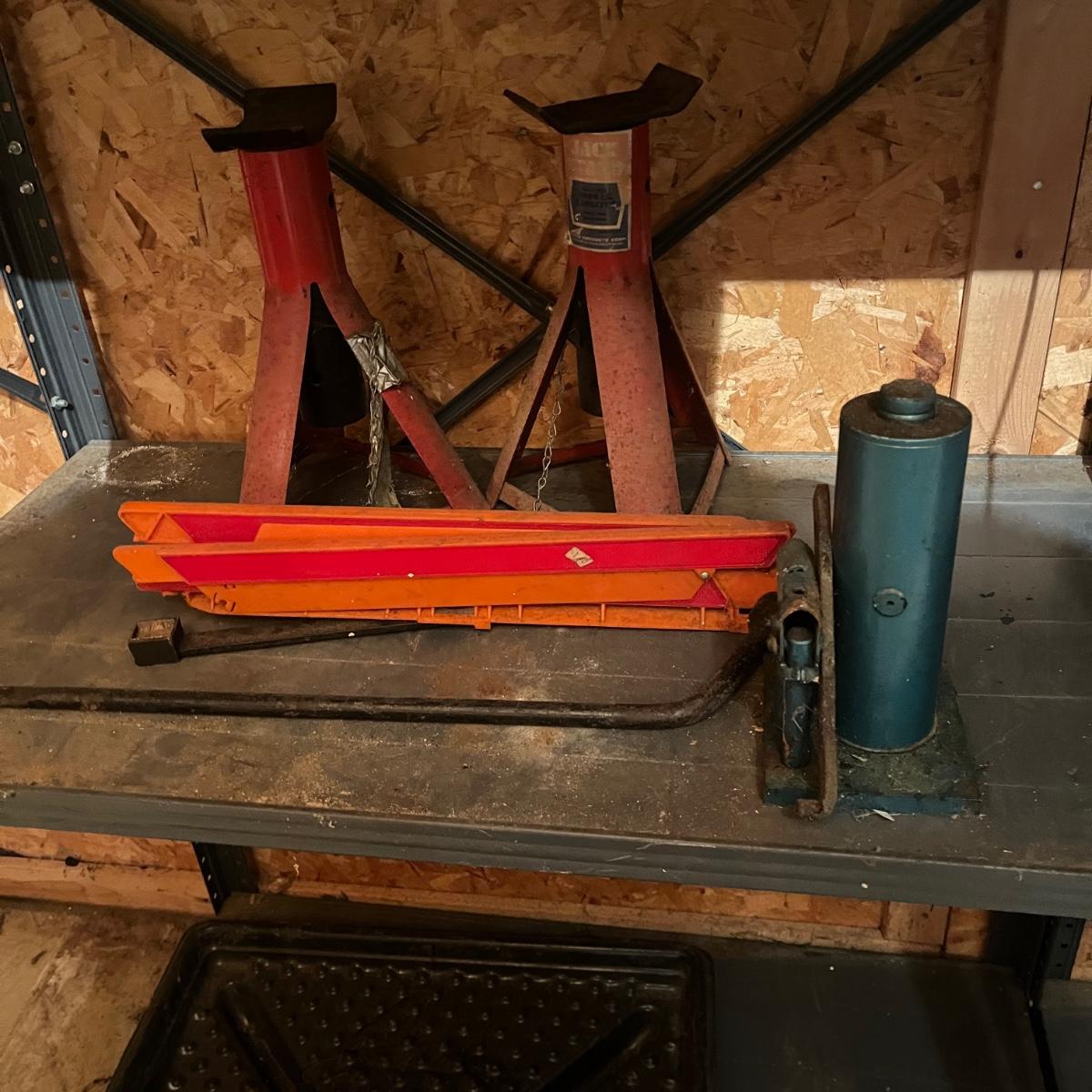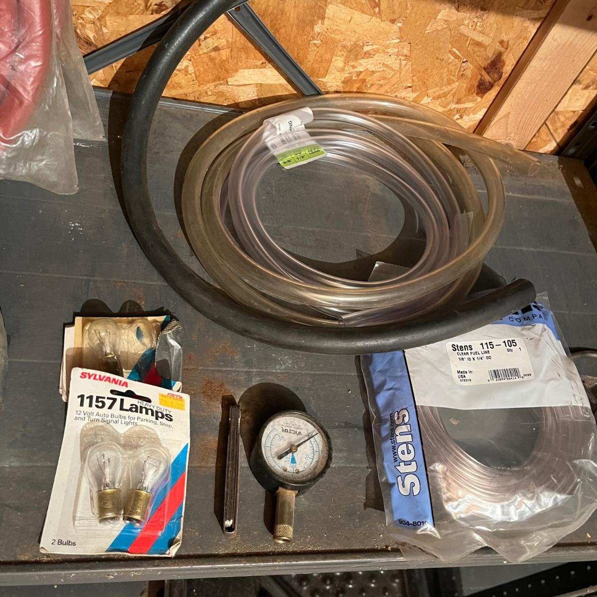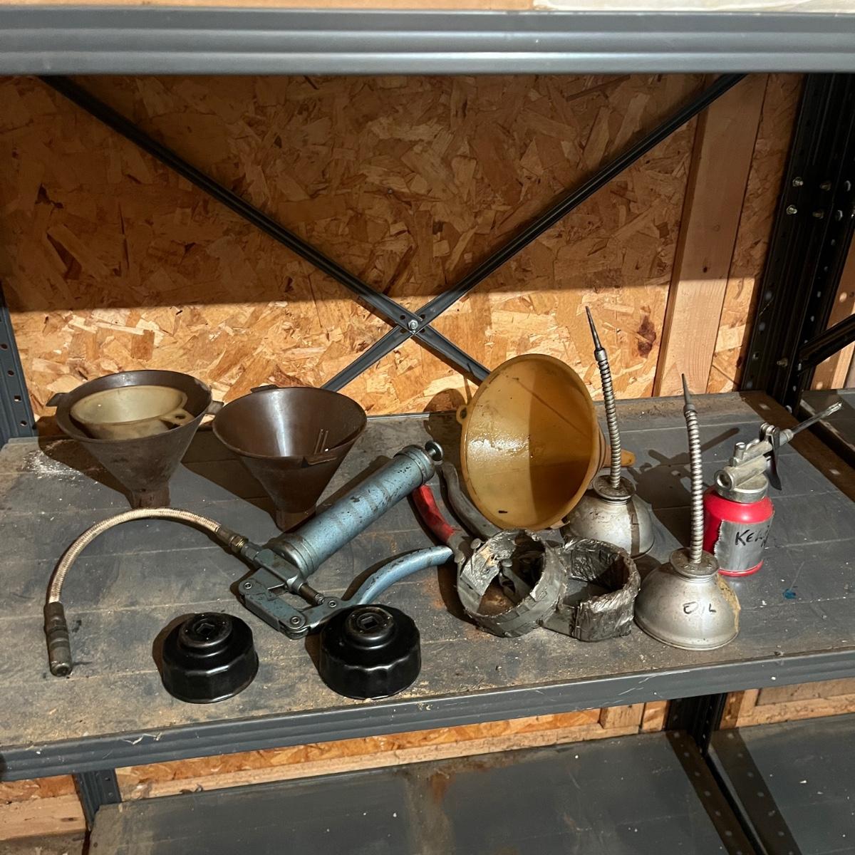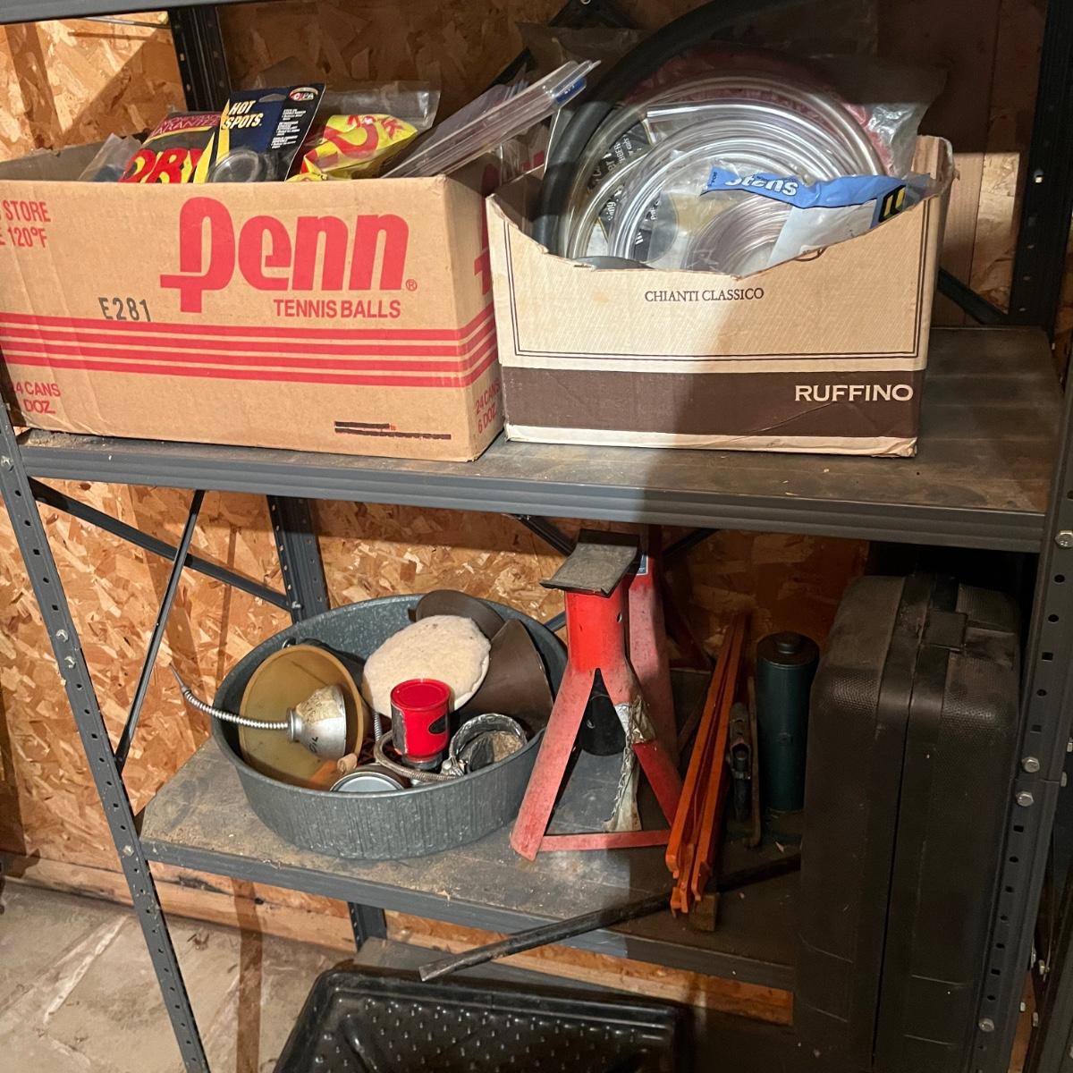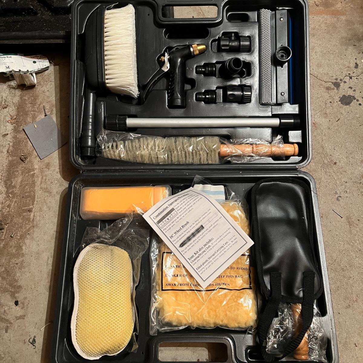 Lot includes Michelin car wash kit , spark plug cleaner, four ton bottle jack, wiper blades, battery terminals, funnels, drain pans, heater hoses, oil cans and more.