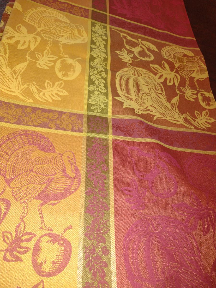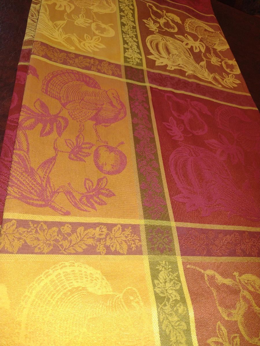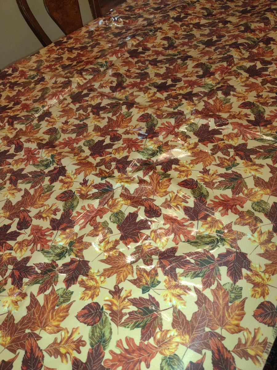 Autumn Design Table Coverings and Napkins (#2). Leaf design cover is vinyl and measures approx 60" x 90". Turkey covering is linen and measures approx 72" x 142". Includes 12 assorted napkins.