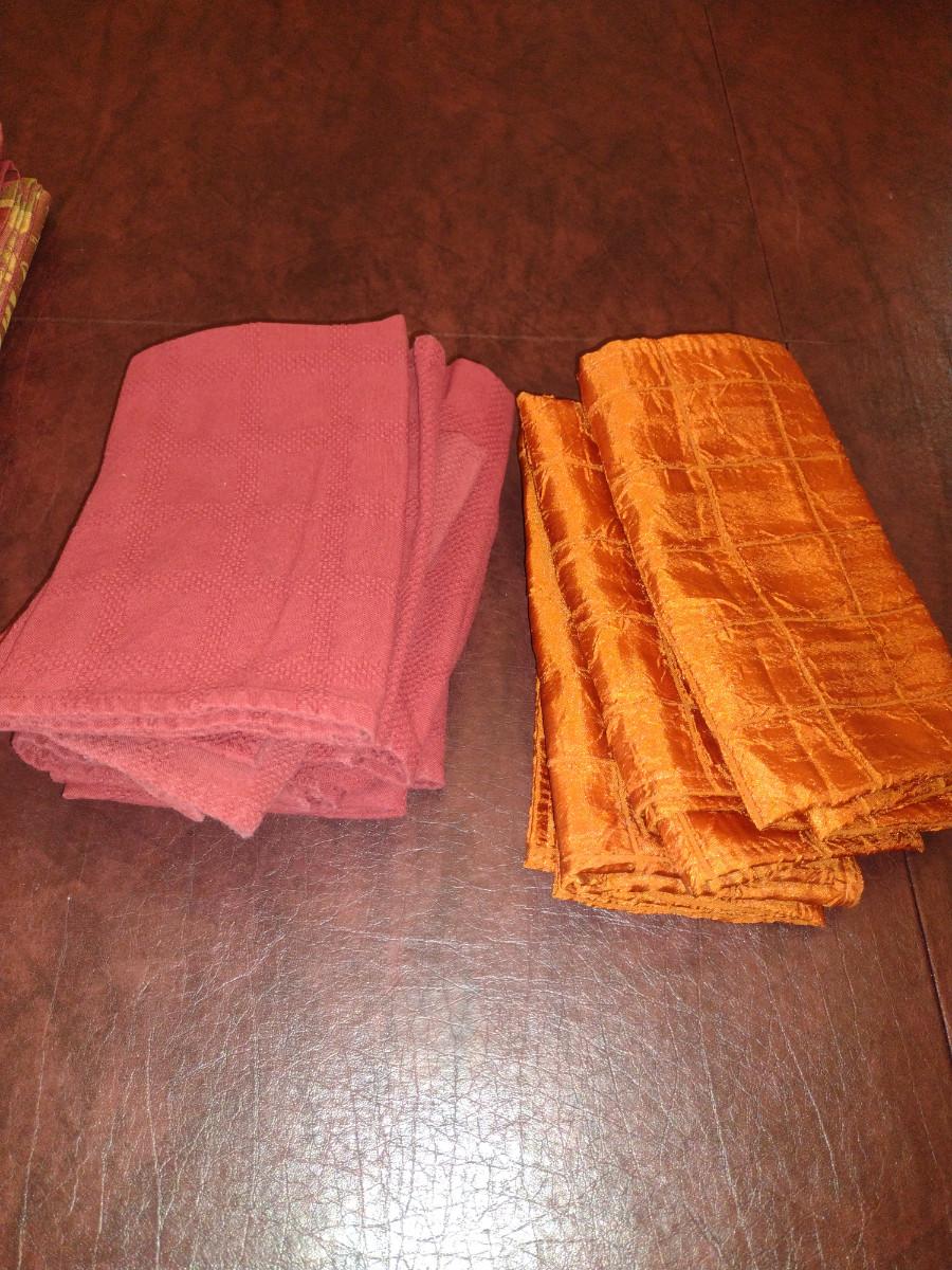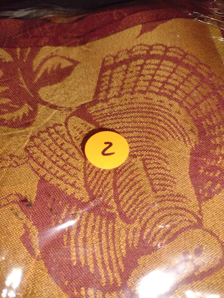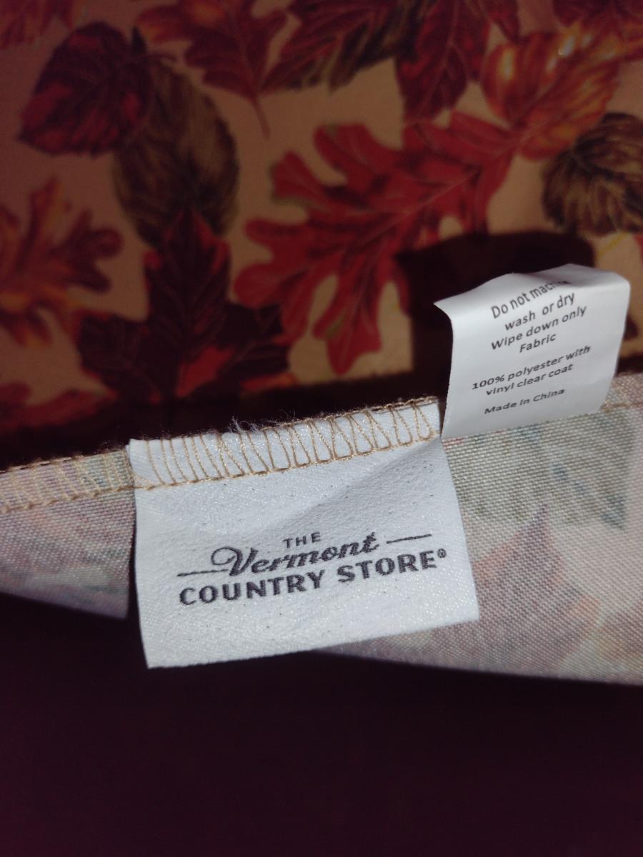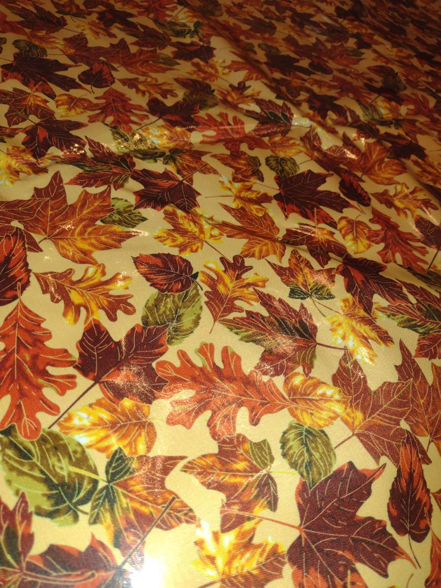 Autumn Design Table Coverings and Napkins (#2). Leaf design cover is vinyl and measures approx 60" x 90". Turkey covering is linen and measures approx 72" x 142". Includes 12 assorted napkins.