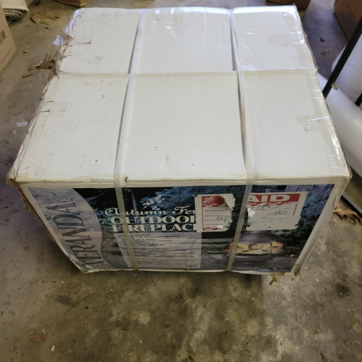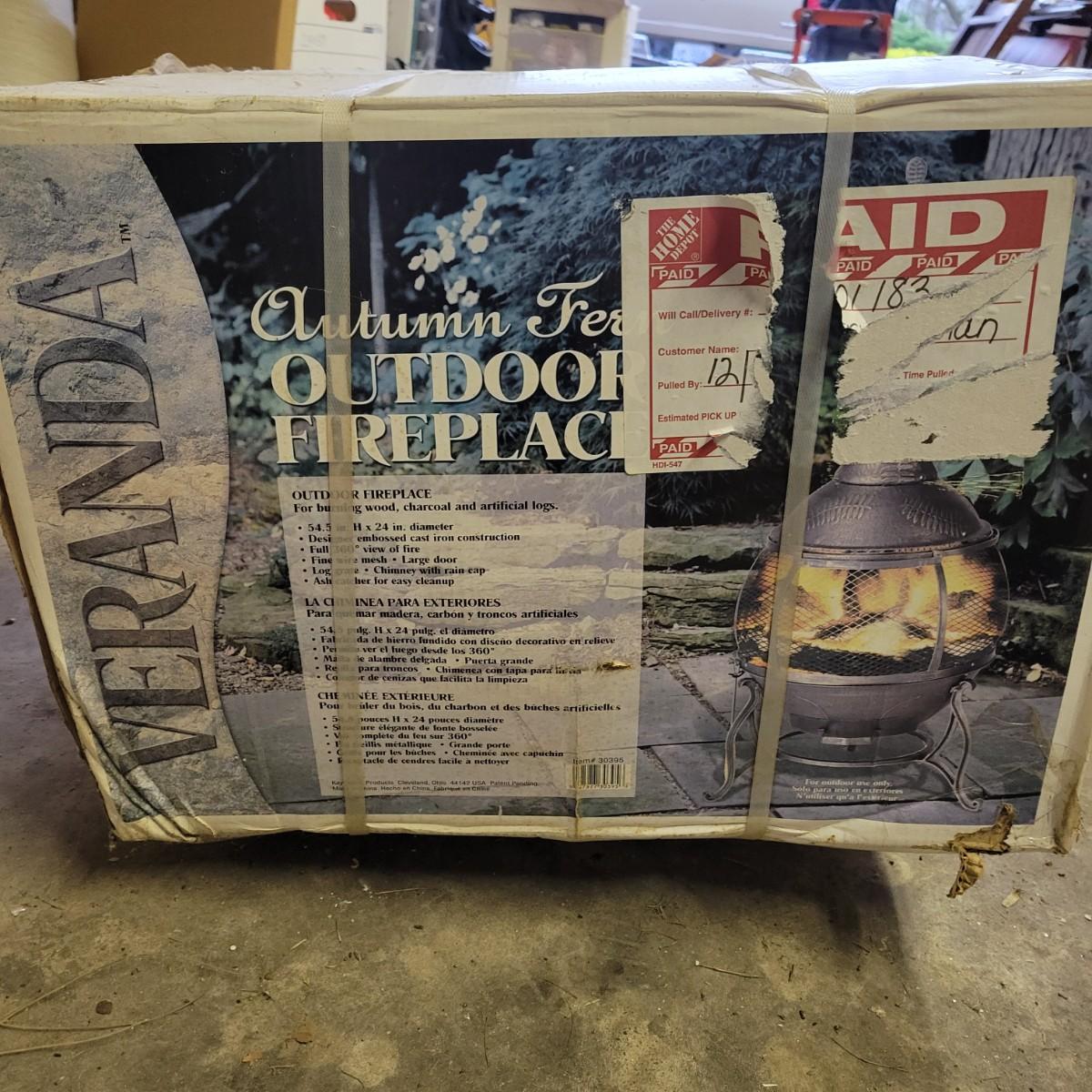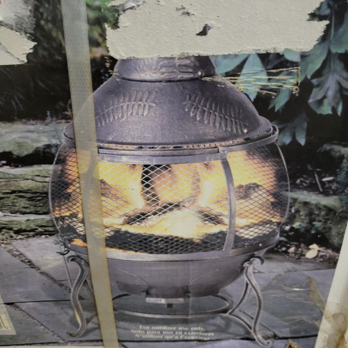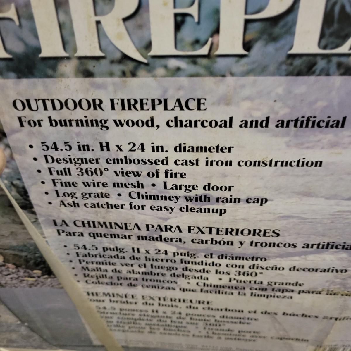 An outdoor fireplace new and its original packaging. Measures approximately 24"D x 54.5"H. It is made of cast iron and has a full 360° view of the fire. Local pickup only. Winning bidder must bring assistance to help move and load this item due to its weight and/or size.