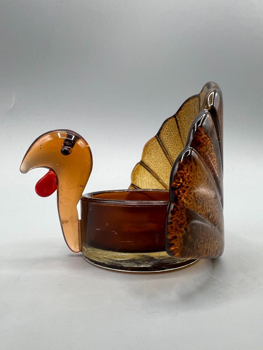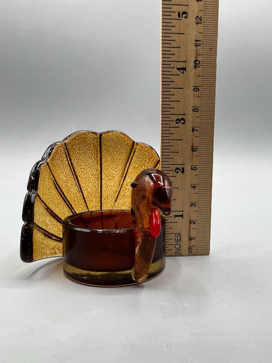 Autumn Holiday Seasonal Glass Turkey Candle Holder, there is some light wear, but there is no significant damage to the glass and is in good useable condition. Check pictures for more details and for sizing.