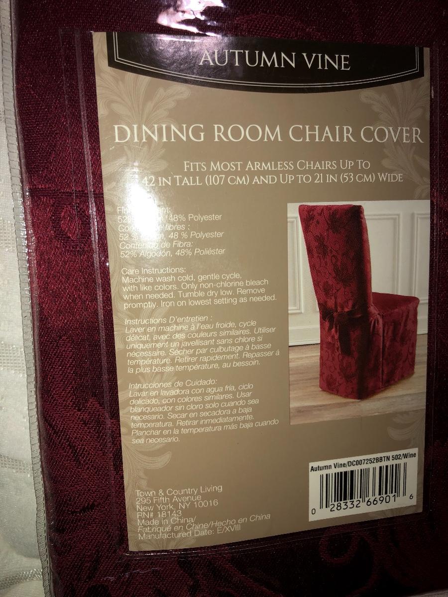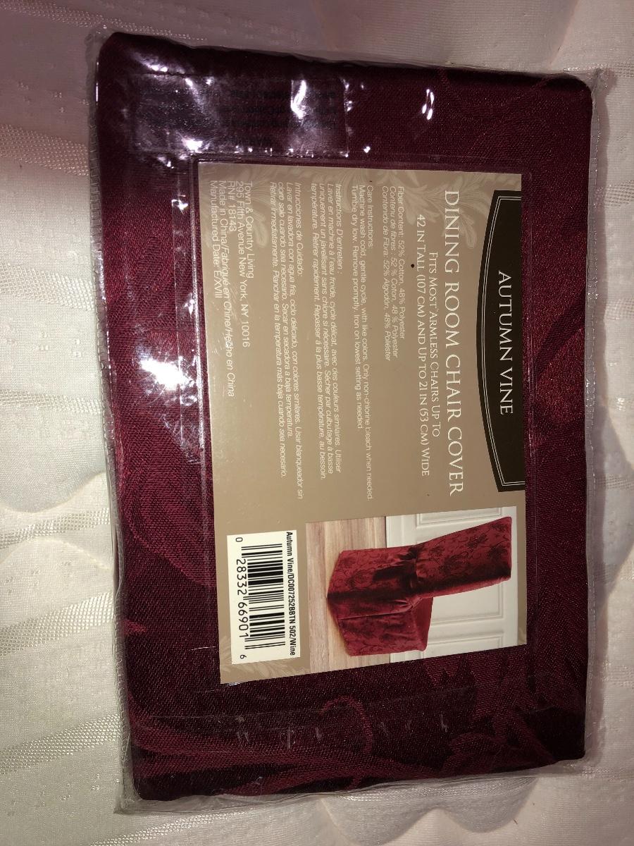This is new in packaging. The color is wine. Fits most armless chairs up to 42” tall and up to 21” wide.