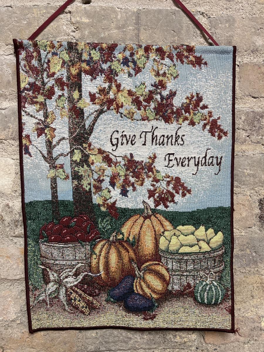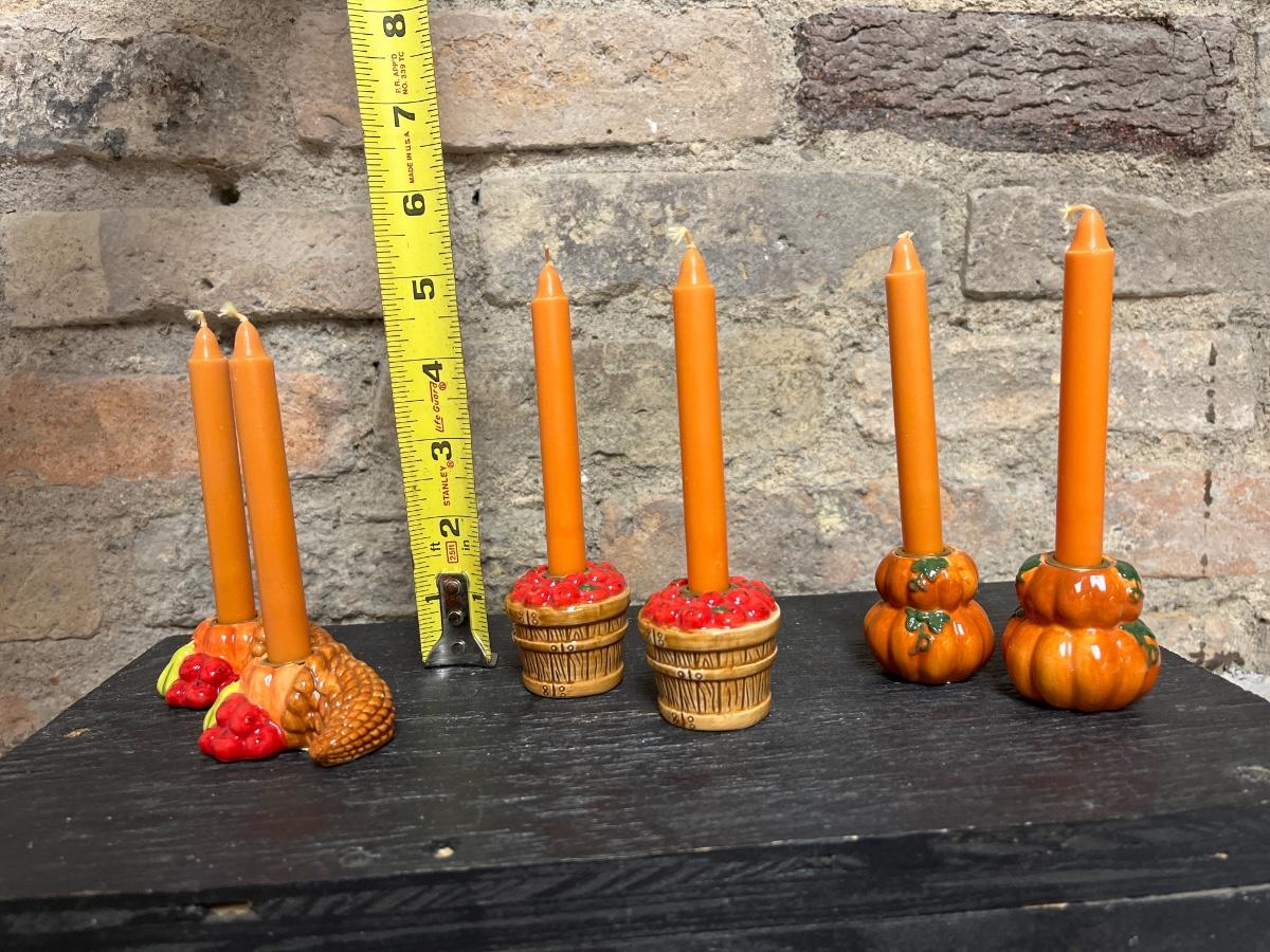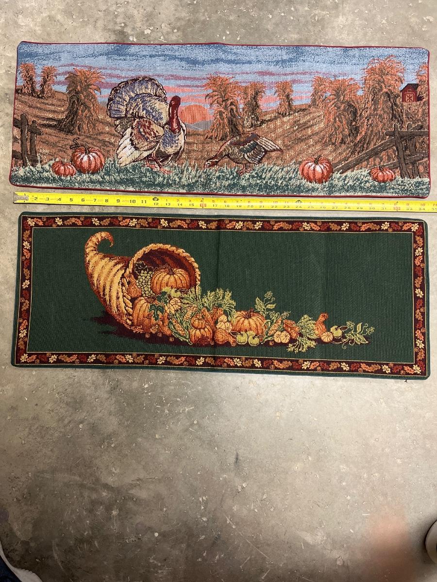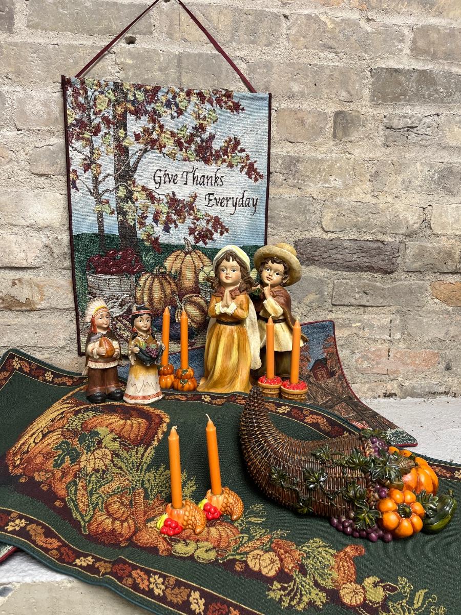 Autumn and Thanksgiving tapestry runners and wall hanging , cornucopia and sweet little candle holders and figurines