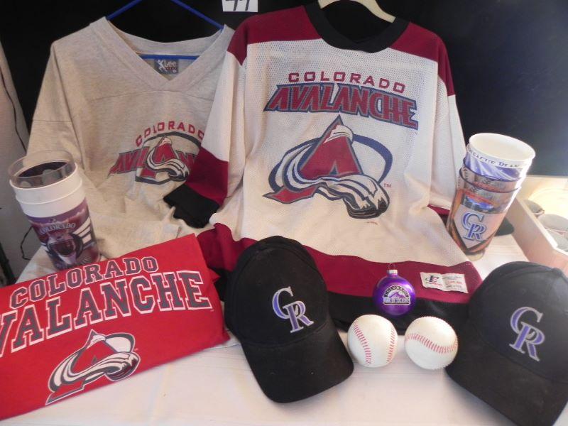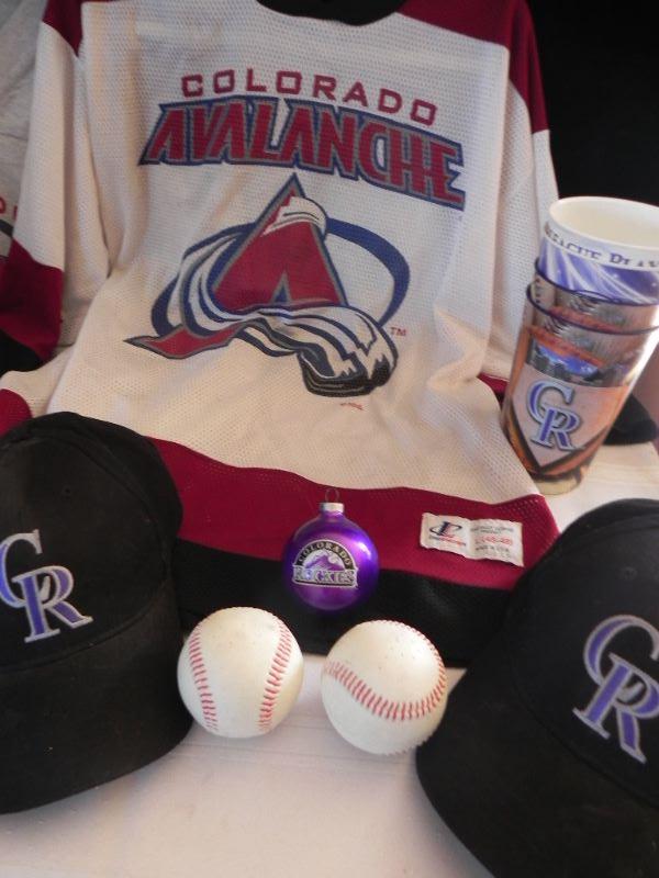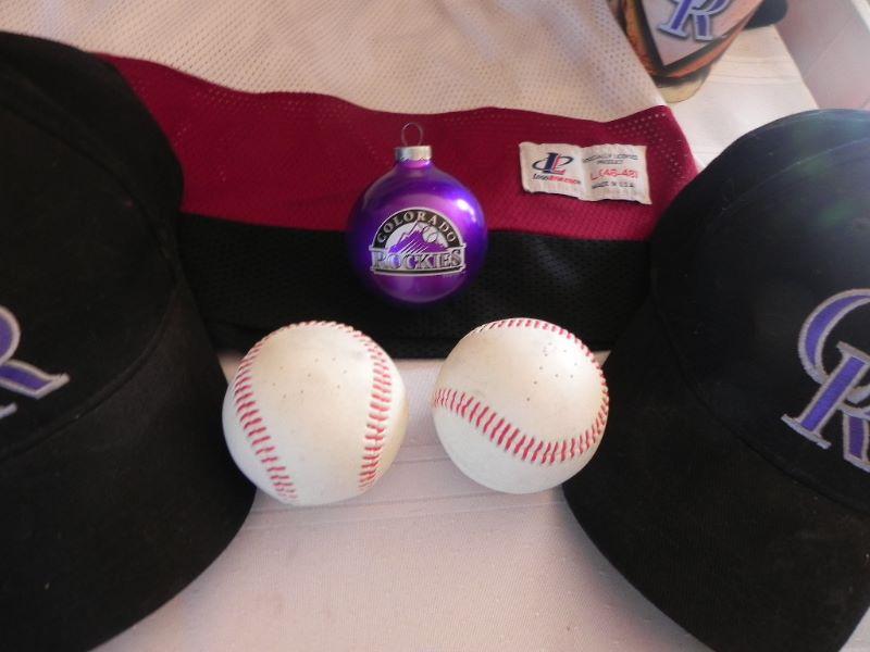 Jerseys XL, shirt medium, CR caps, Rockies ornament, baseball salt & pepper shakers, plastic cups