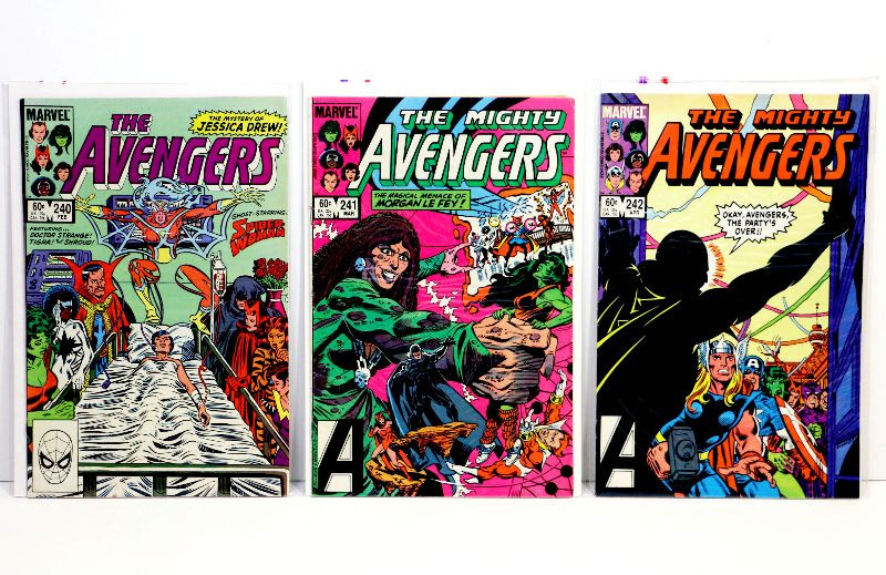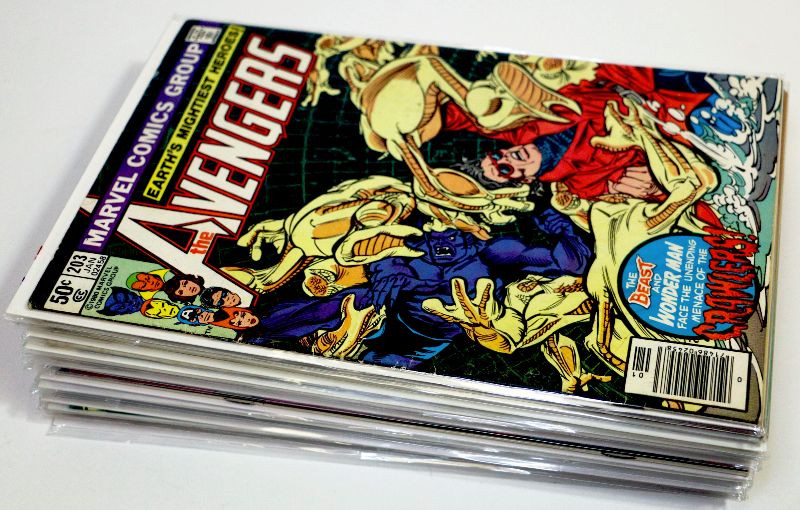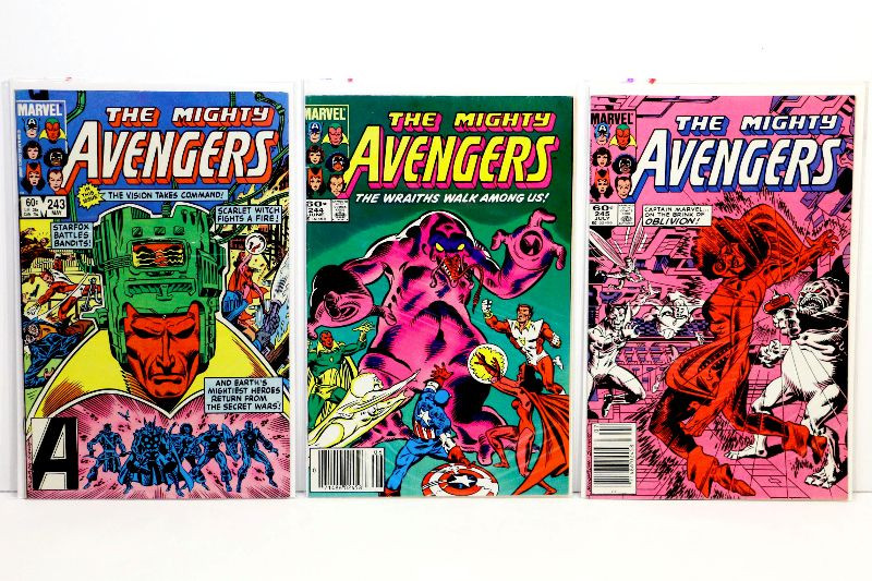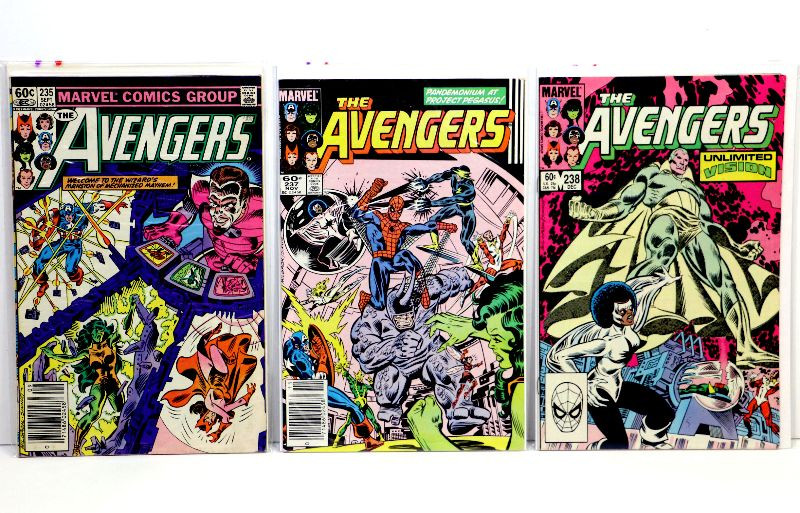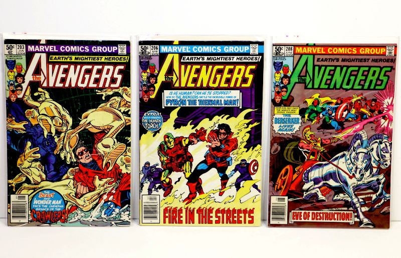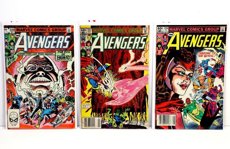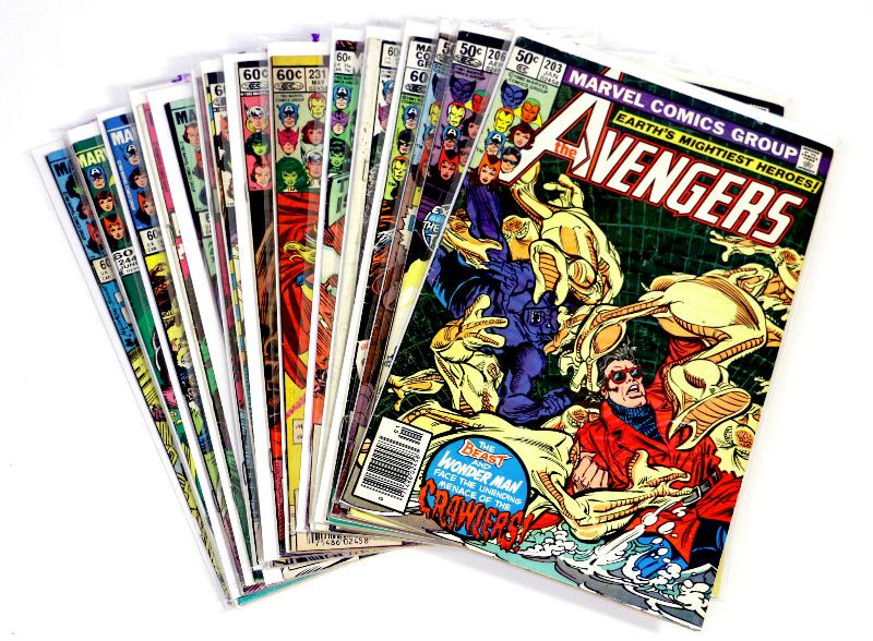 Set of 20 Bronze Age AVENGERS comic books, included are following issues: 203, 206, 208, 215, 225, 226, 229, 231, 234, 235, 237, 238, 240, 241, 242, 243, 244, 245, 246, 247 - very nice run, all books in higher grade ranging from fine to very fine condition. Comics published by Marvel back in 1981-84..