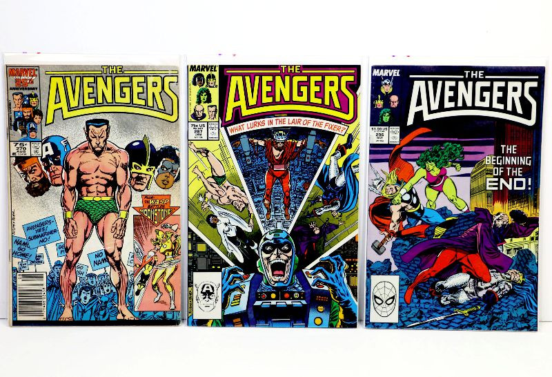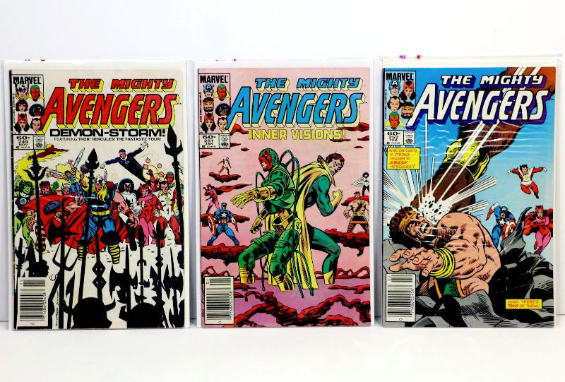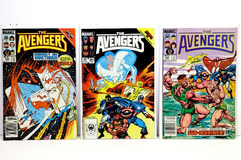 Set of 20 Copper Age AVENGERS comic books, included are following issues: 249, 251, 252, 253, 255, 256, 260, 261, 262, 264, 266, 267, 270, 287, 296, 299, 300, 301, 304, 307 - very nice run, all books in higher grade ranging from fine to very fine condition, only #270 in slightly lower vg/fn grade. Comics published by Marvel back in 1984-89.