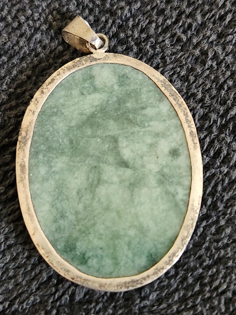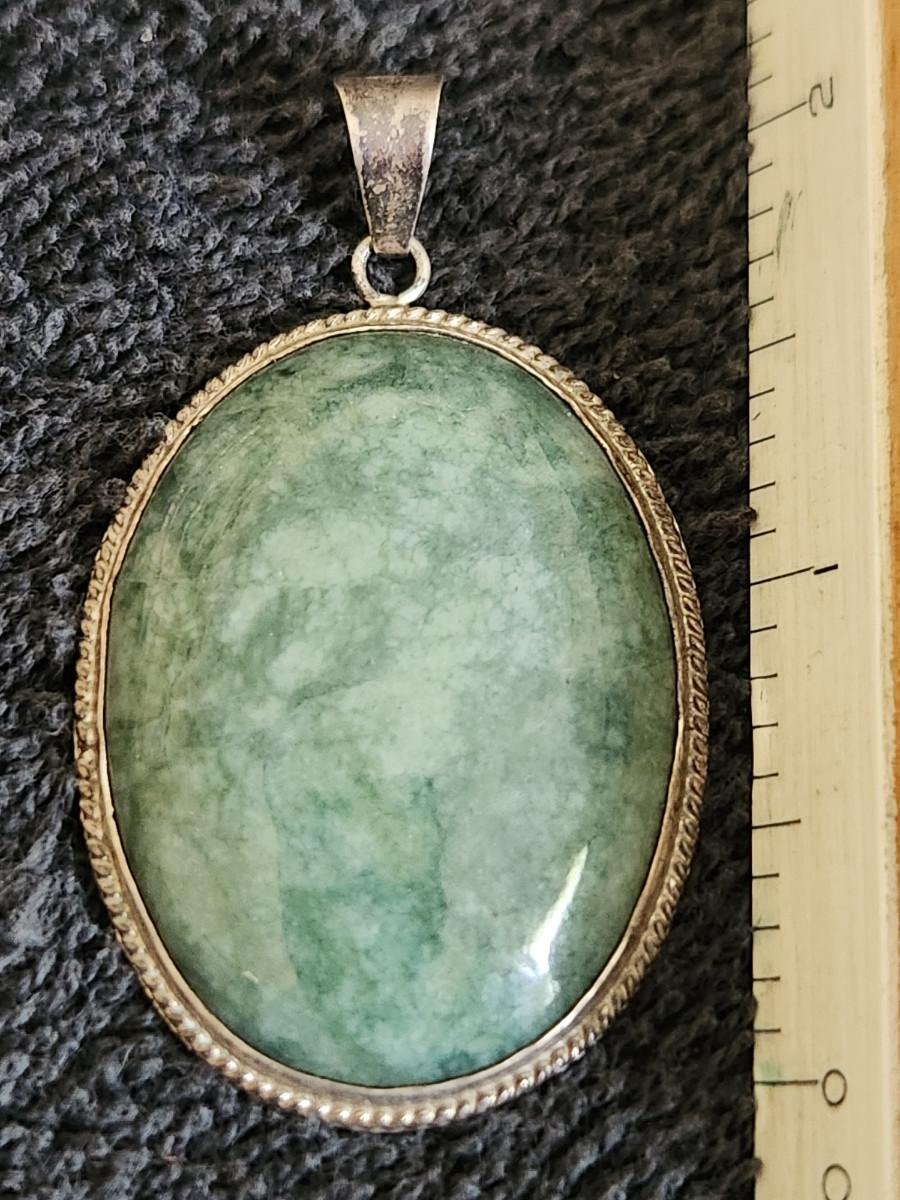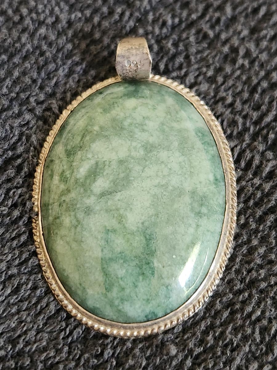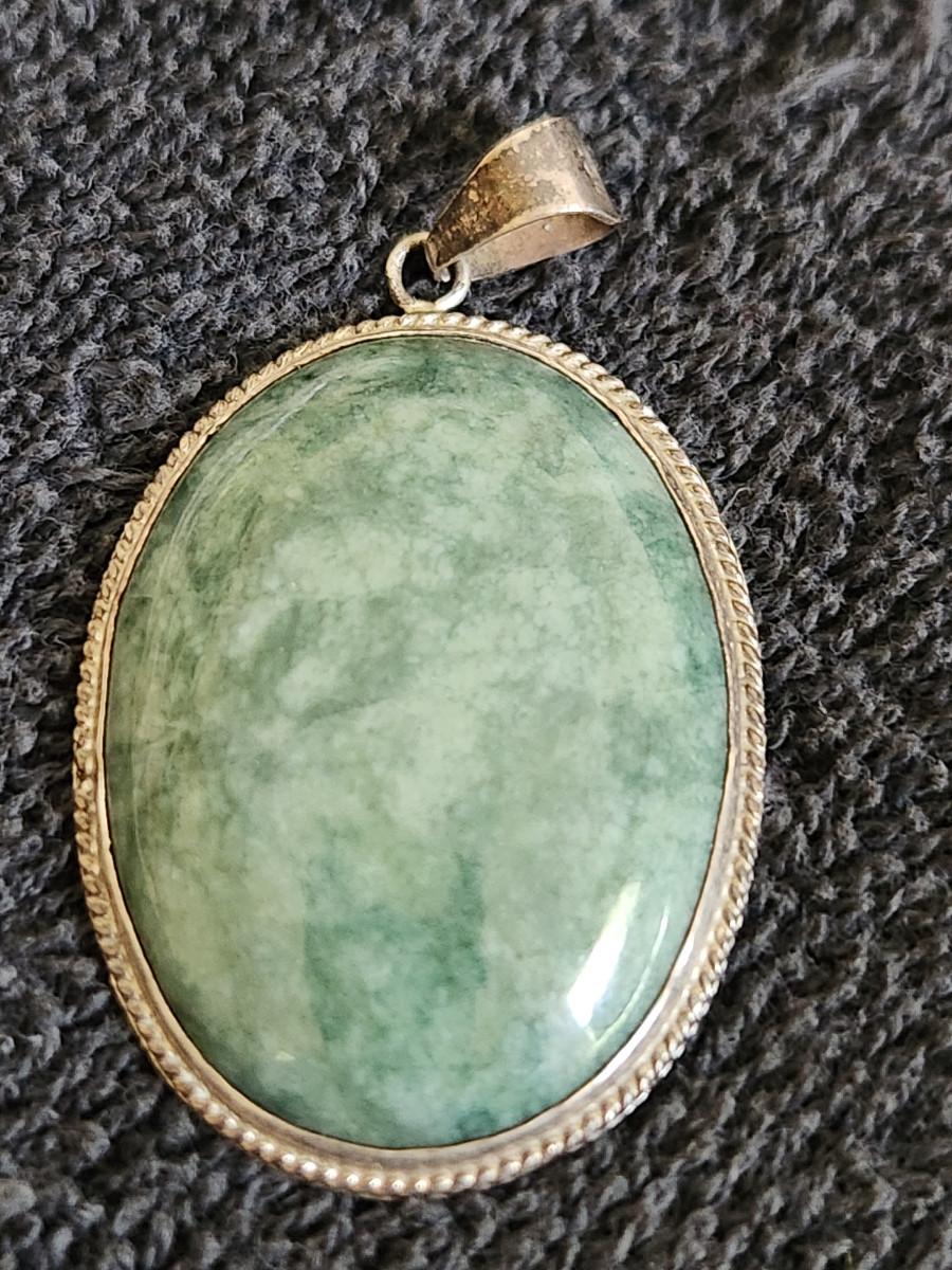 This auction lot is for an Aventurine Stone Pendant set in a Sterling Holder. Aventurine is a form of quartzite, characterized by its translucency and the presence of mineral inclusions that give it a glistening effect termed aventurescence. The stone aventurine, particularly green aventurine, is widely believed to offer numerous benefits, both emotionally and physically, and is often associated with positive energy and spiritual growth. It's thought to promote emotional balance, boost confidence, reduce stress, and even aid in certain physical ailments