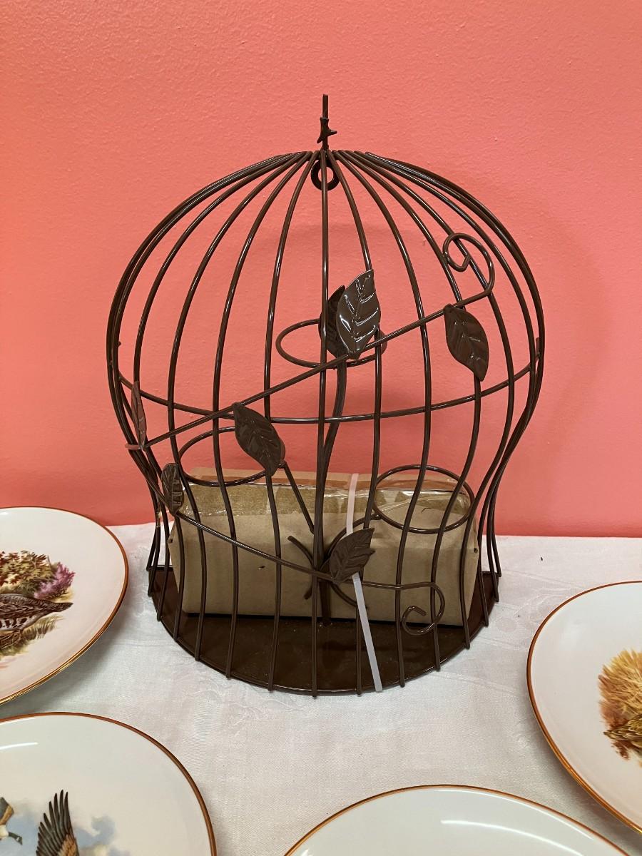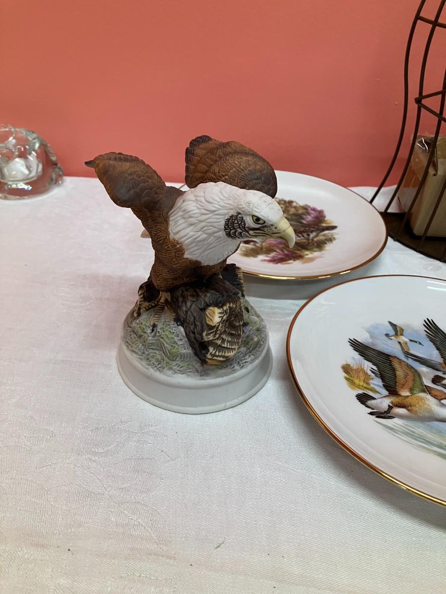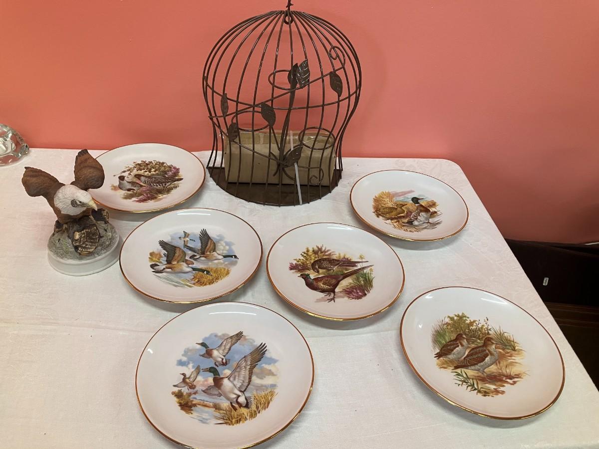 Grouping of 6 collectible bird plates, a bird cage votive candle holder, and a collectible bald eagle figurine