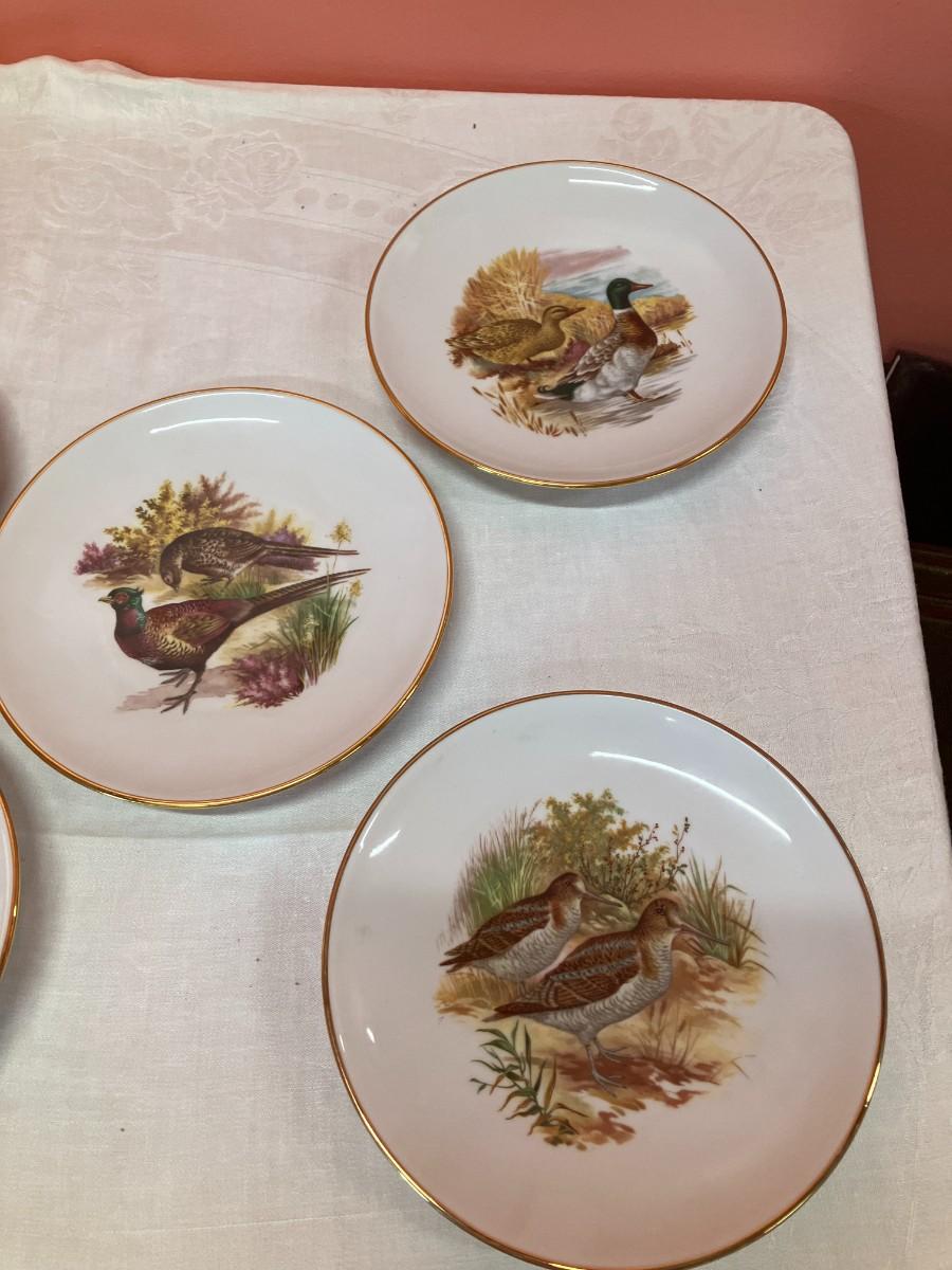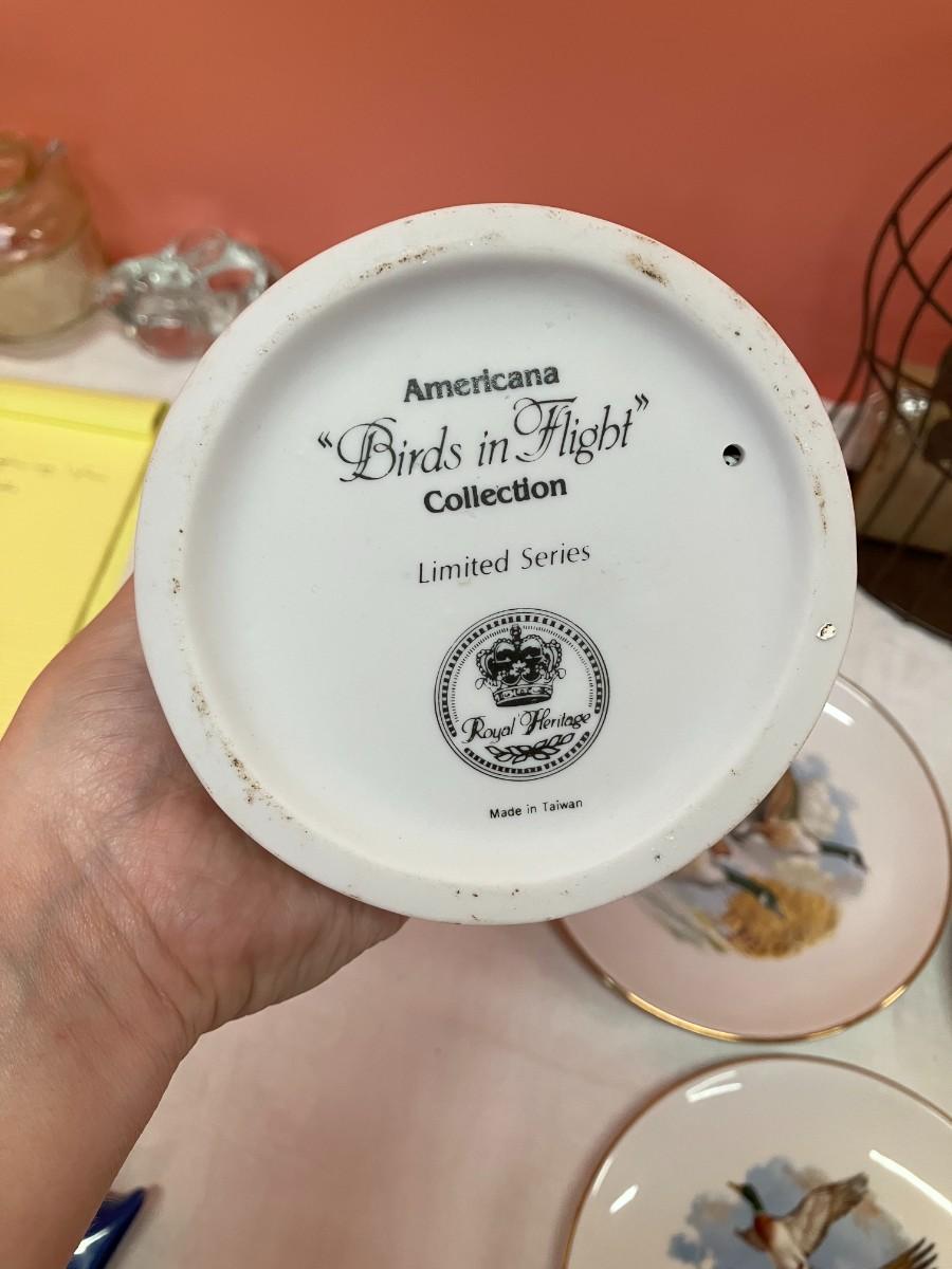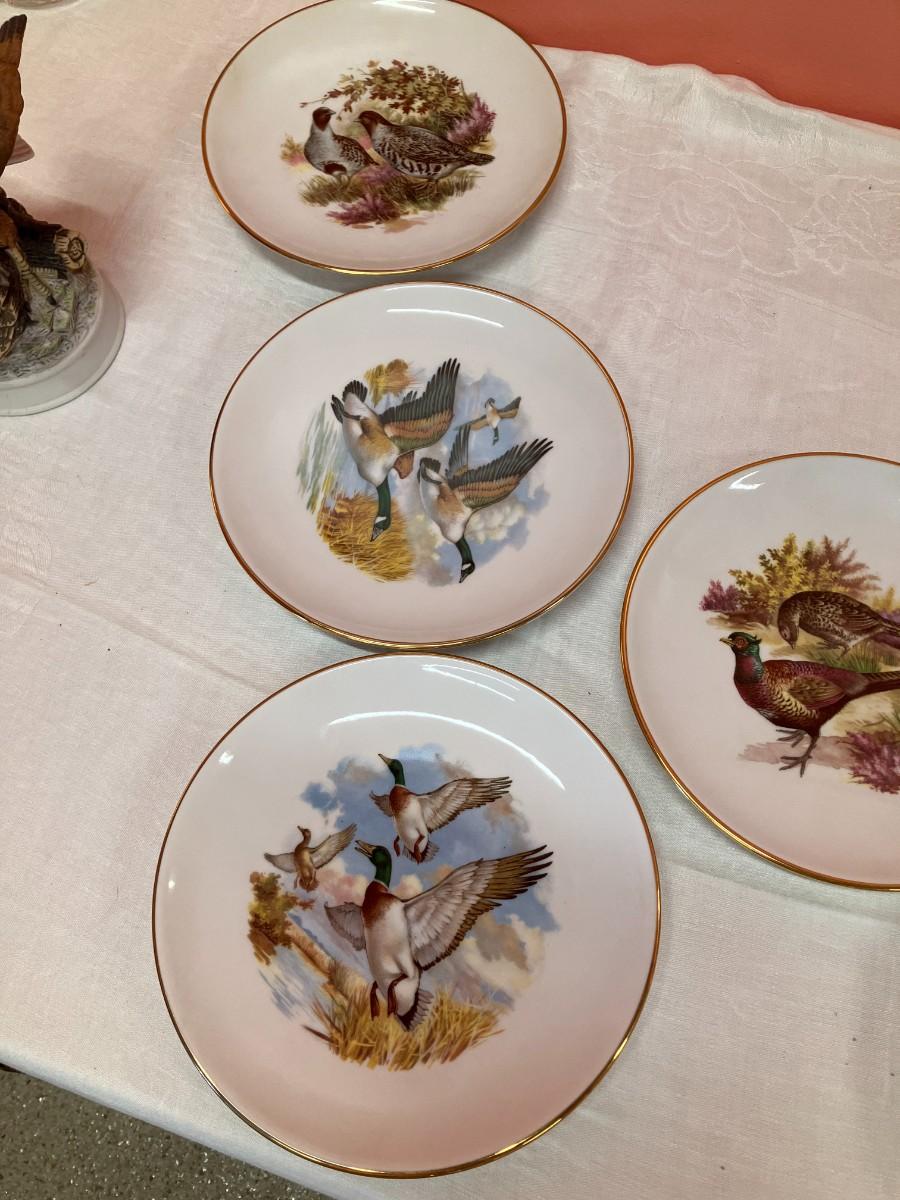 Grouping of 6 collectible bird plates, a bird cage votive candle holder, and a collectible bald eagle figurine