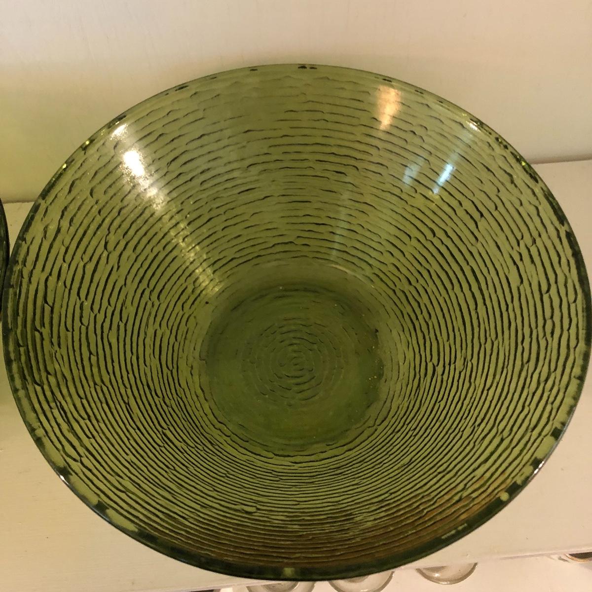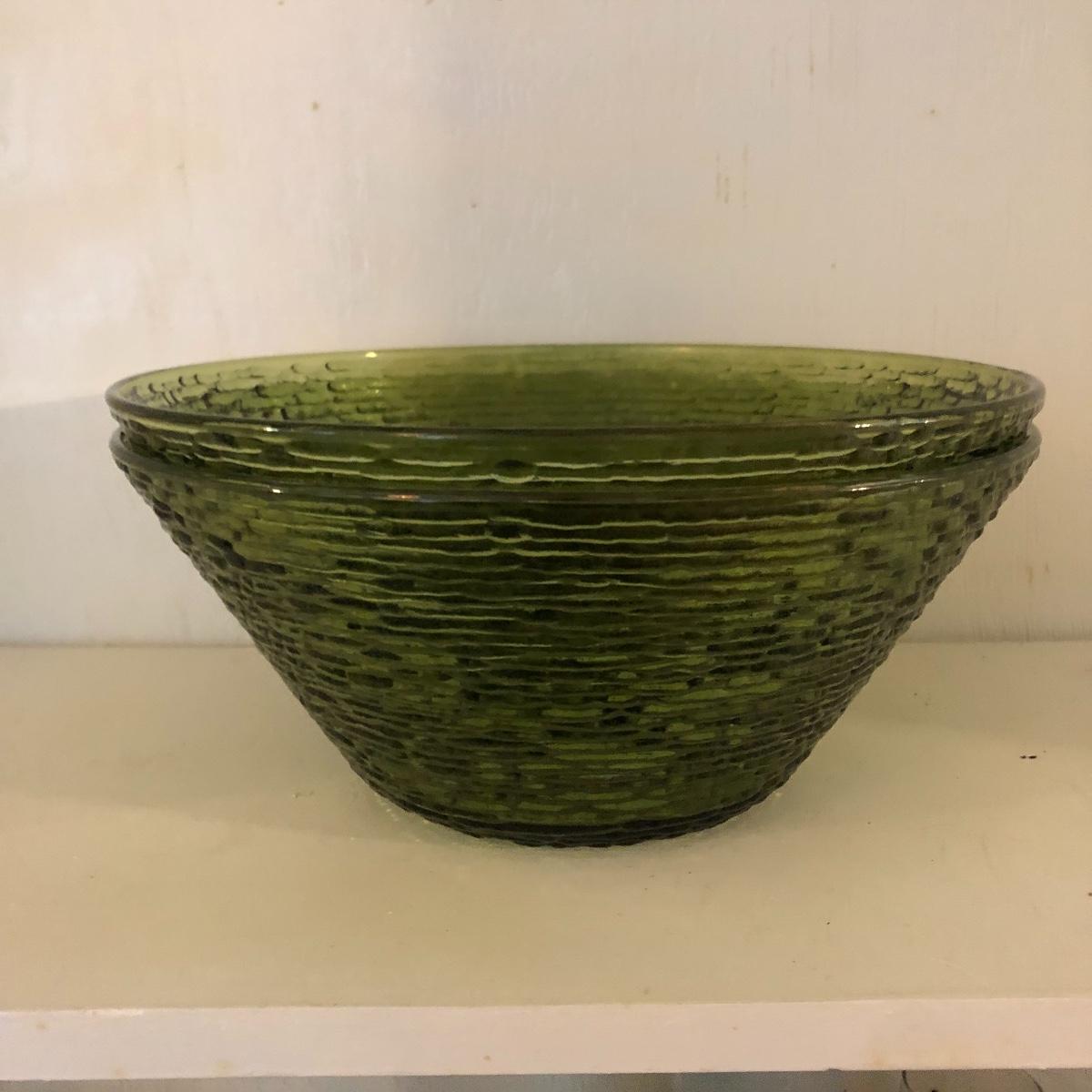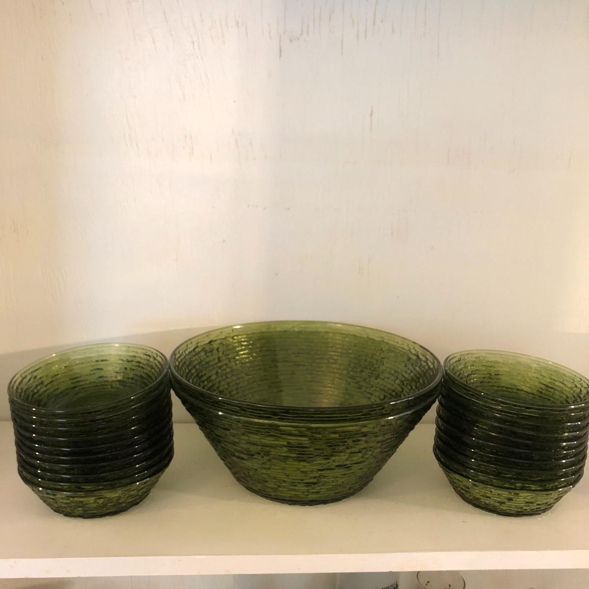 Lot includes two avocado green large salad bowls with twenty matching individual serving bowls. Bowls have a raised ridge all over, see pictures. Large bowls measure 11.25”D x 5” tall.