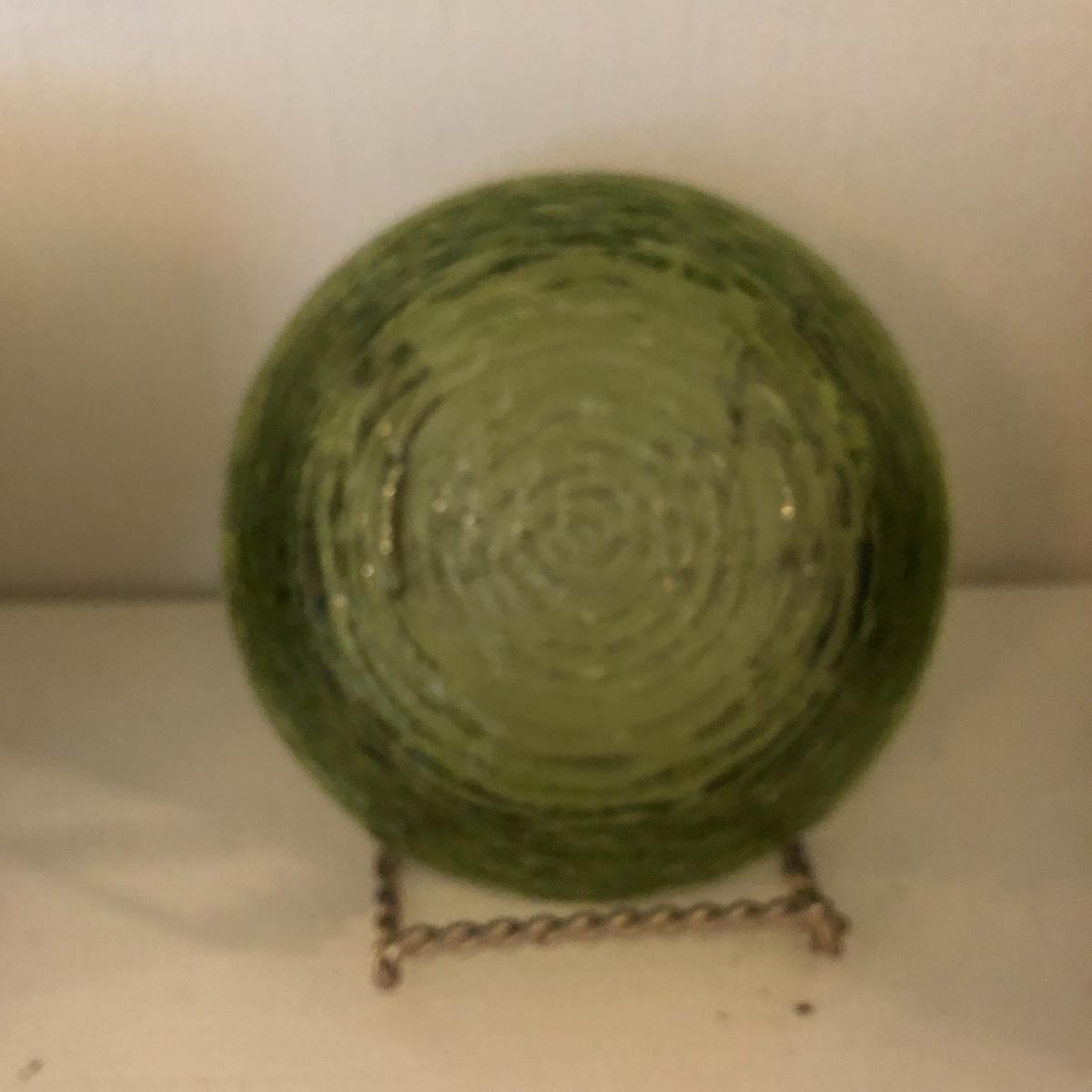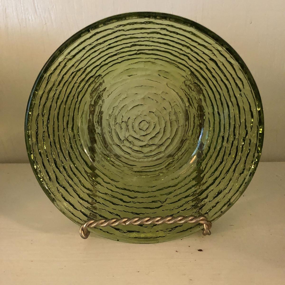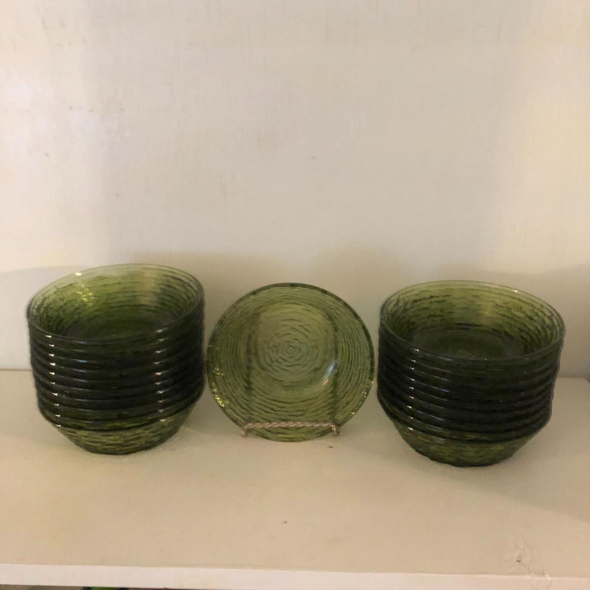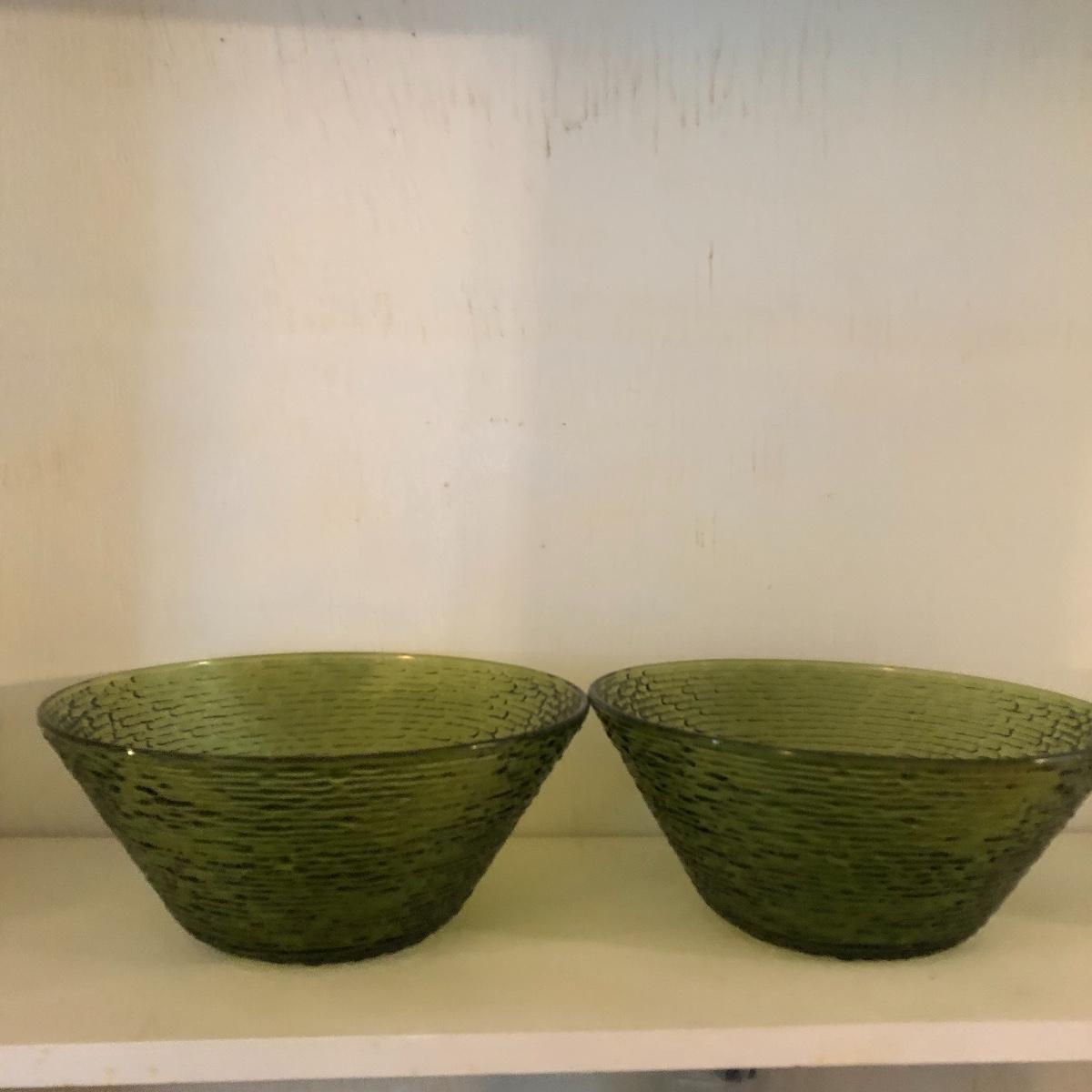 Lot includes two avocado green large salad bowls with twenty matching individual serving bowls. Bowls have a raised ridge all over, see pictures. Large bowls measure 11.25”D x 5” tall.